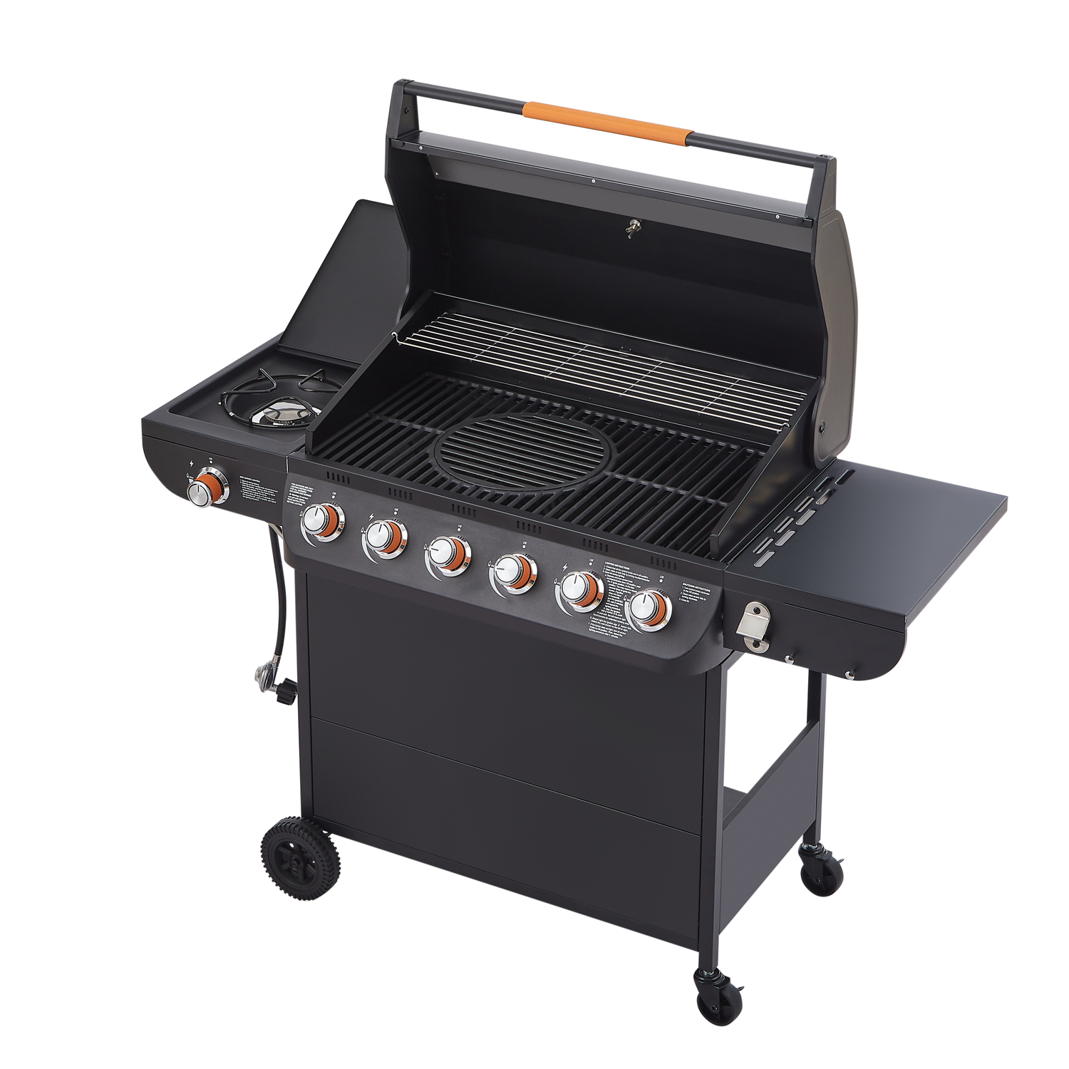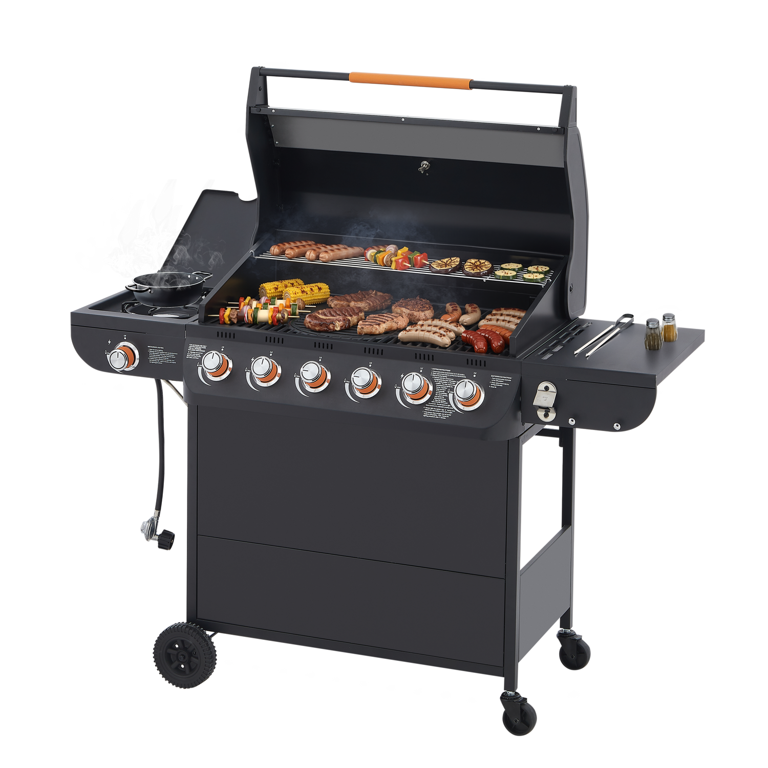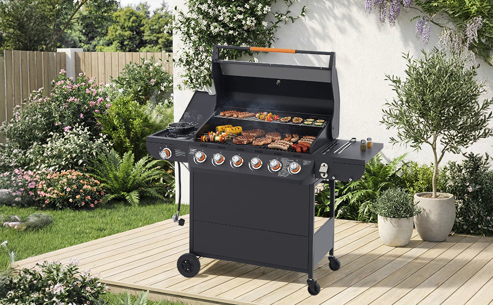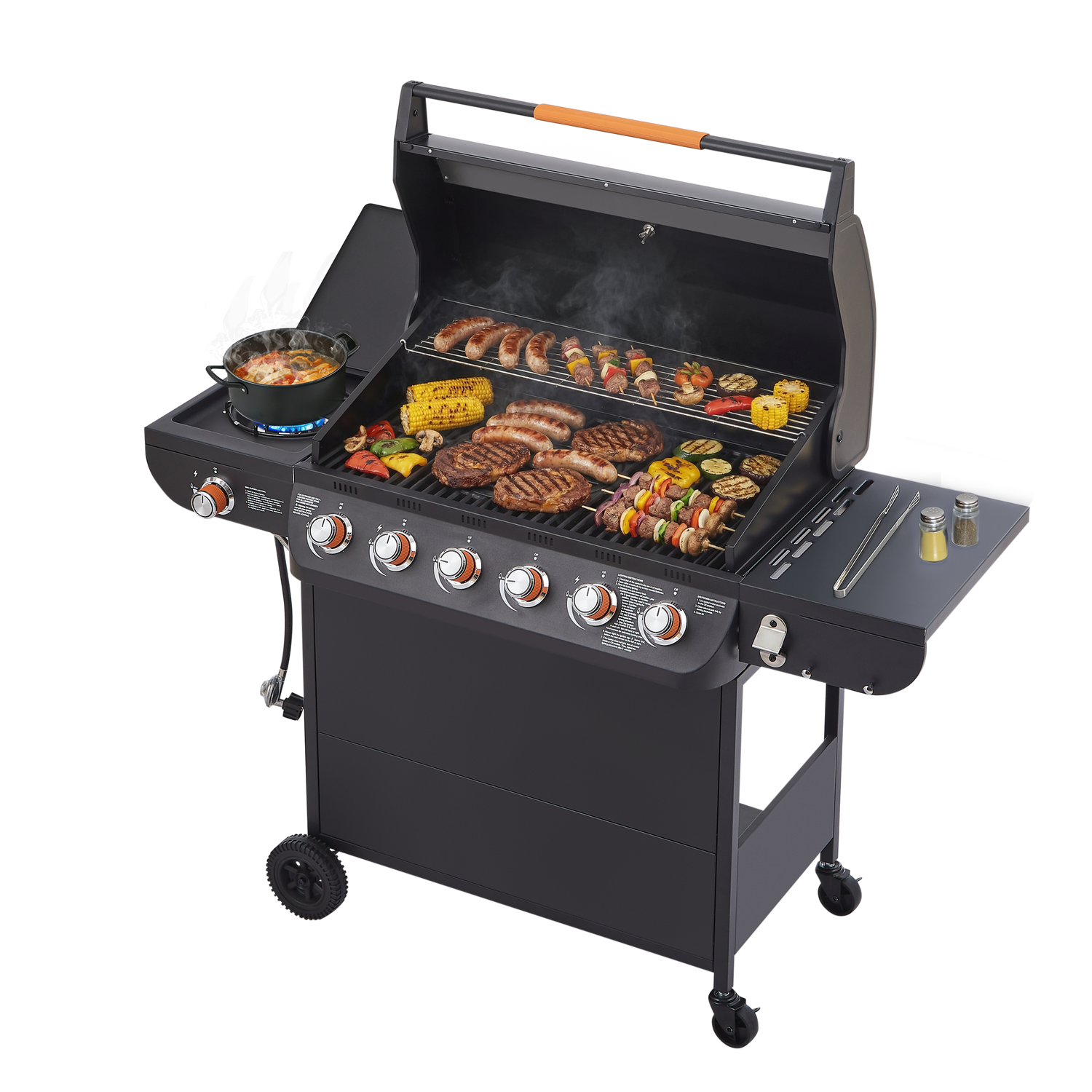 • This outdoor gas grill features 6 main burners and 1 side burner, delivering a total of 72000 BTU; Perfect for searing steaks and cooking with pots and pans, The piezoelectric ignition ensures easy startup.
