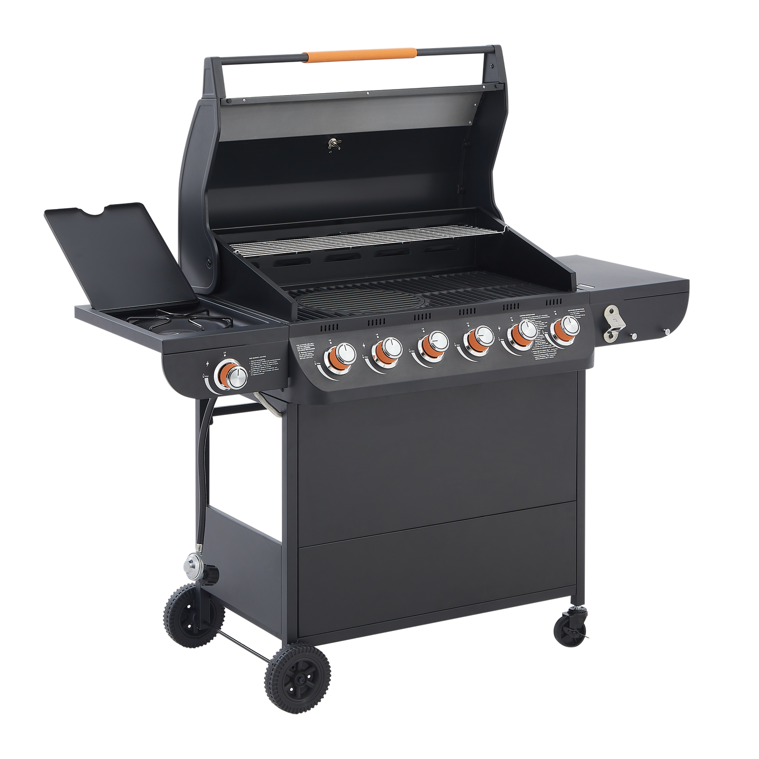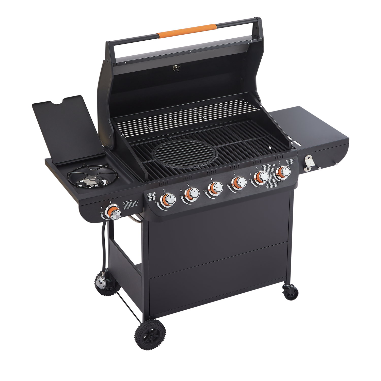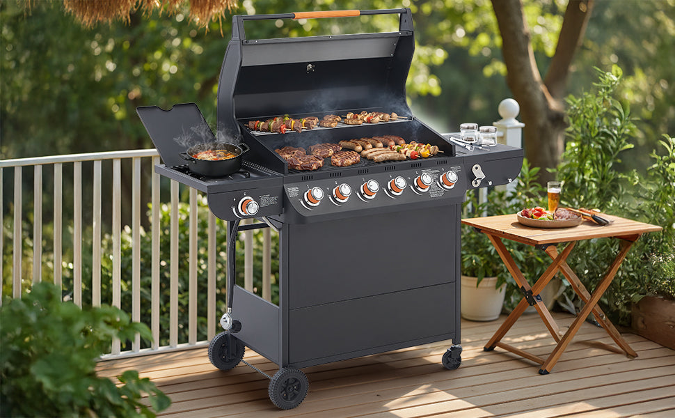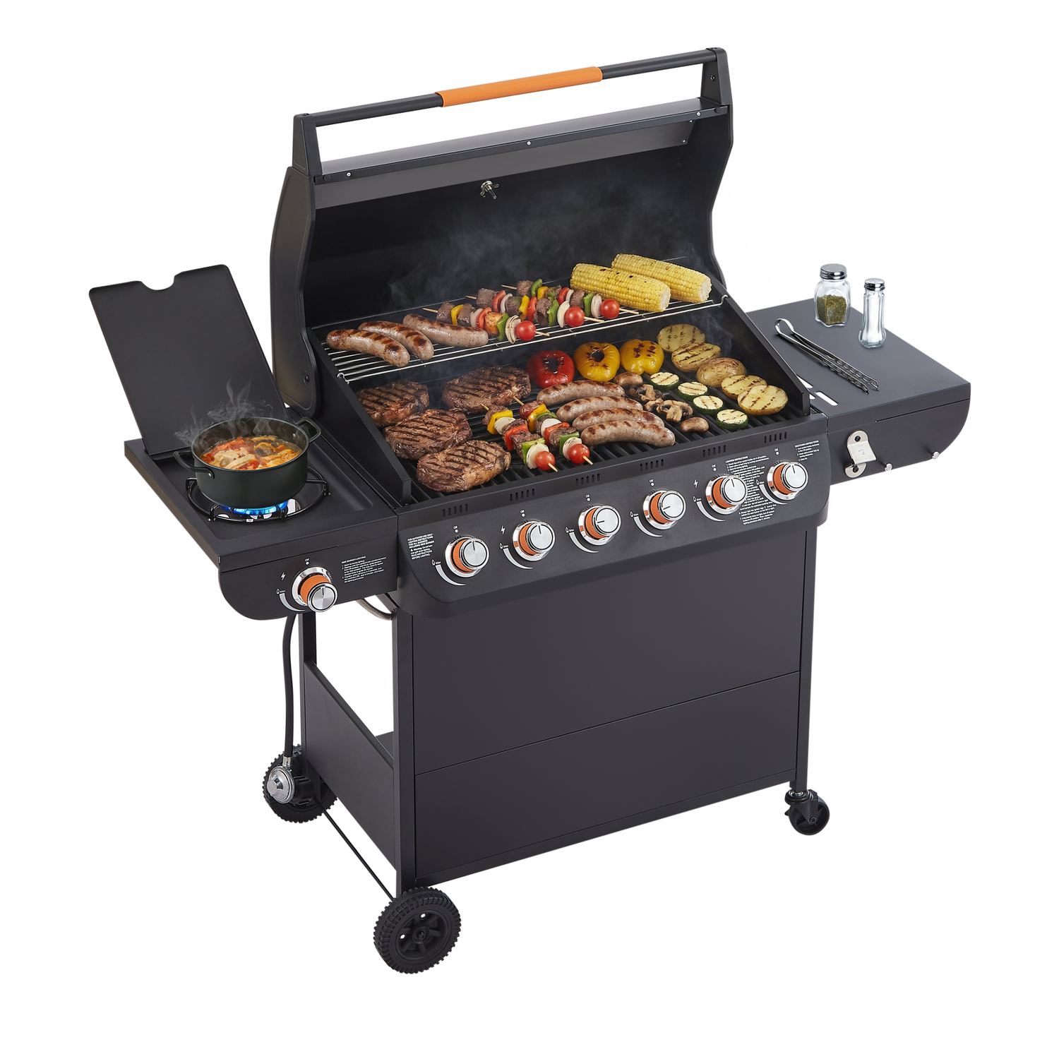 • This outdoor gas grill features 6 main burners and 1 side burner, delivering a total of 72000 BTU; Perfect for searing steaks and cooking with pots and pans, The piezoelectric ignition ensures easy startup.