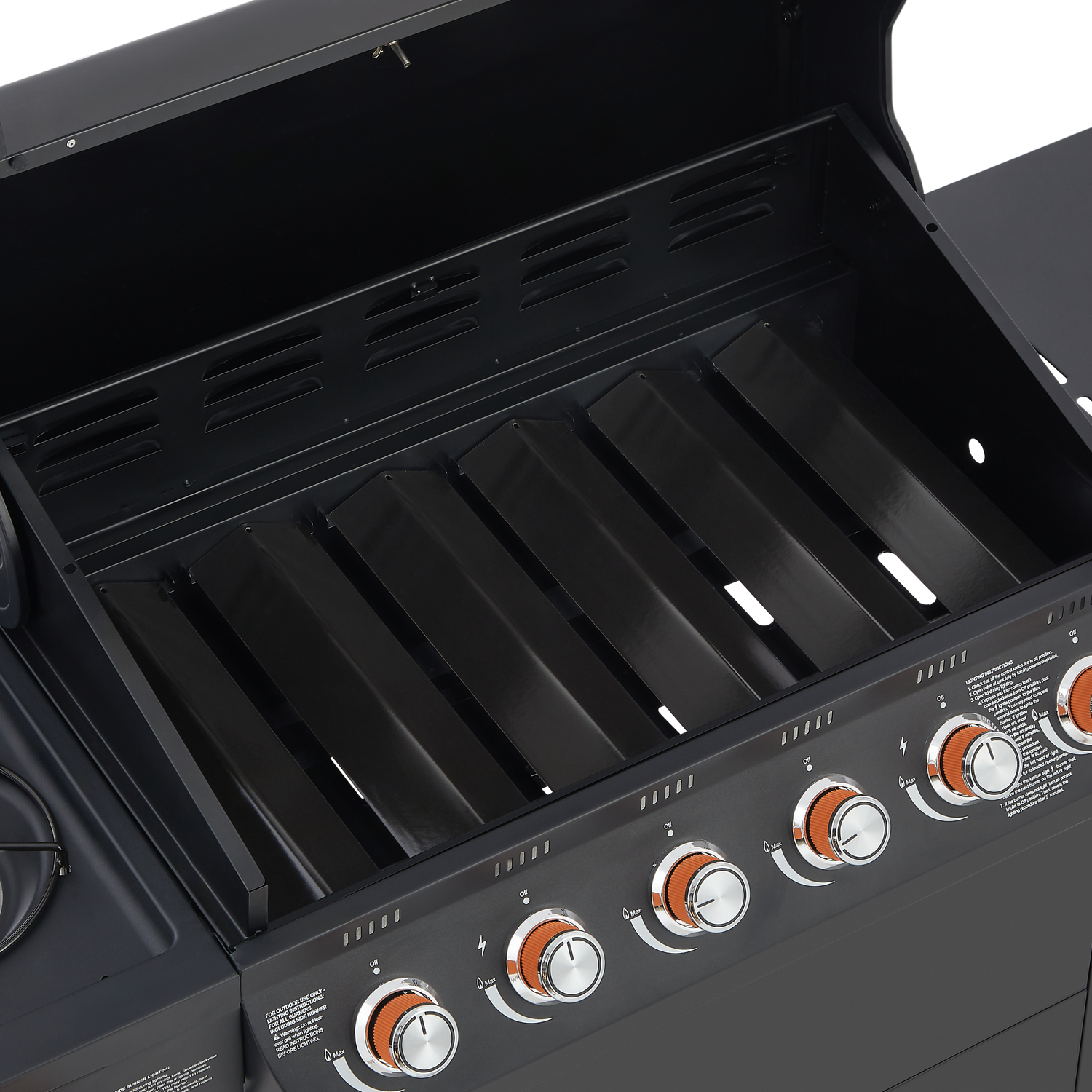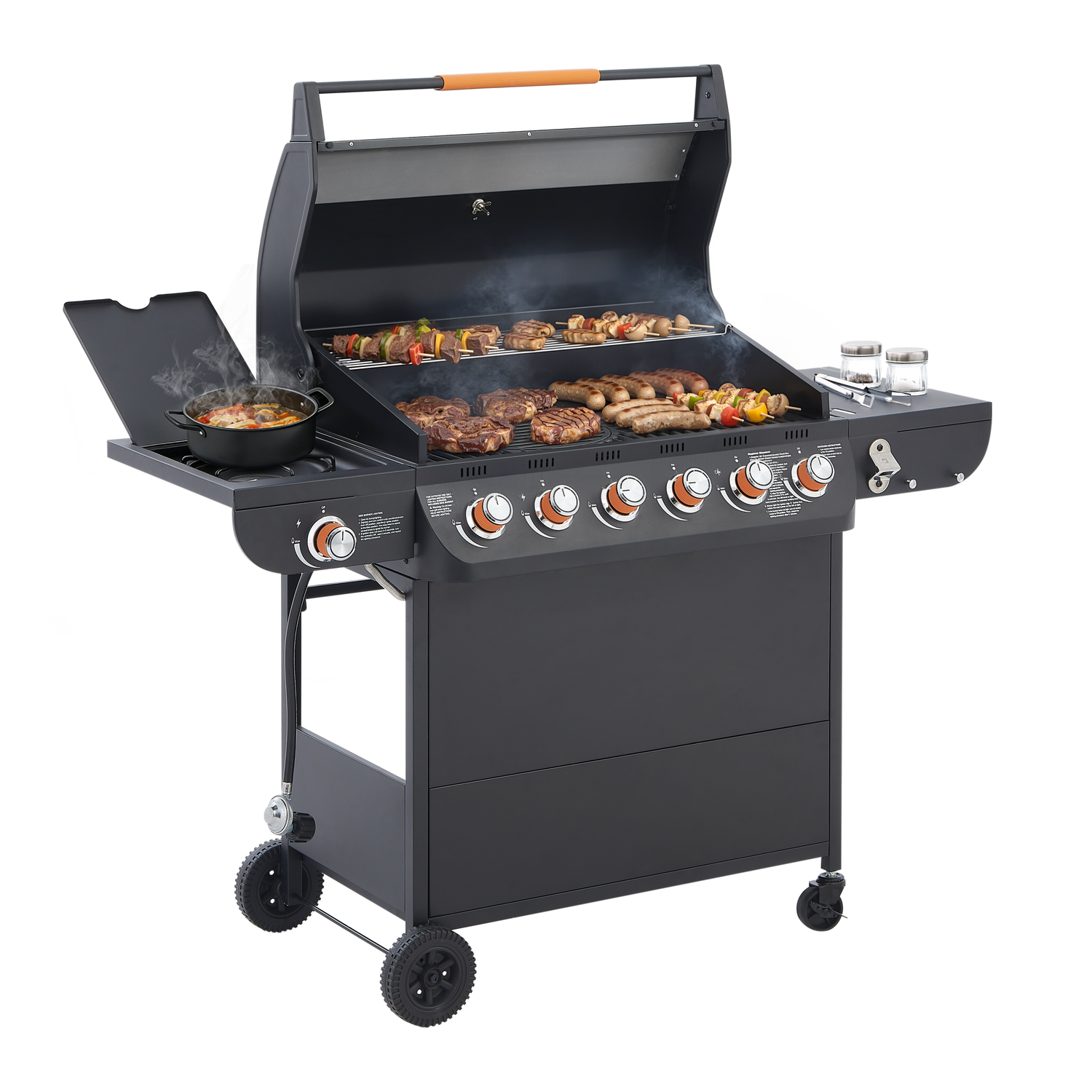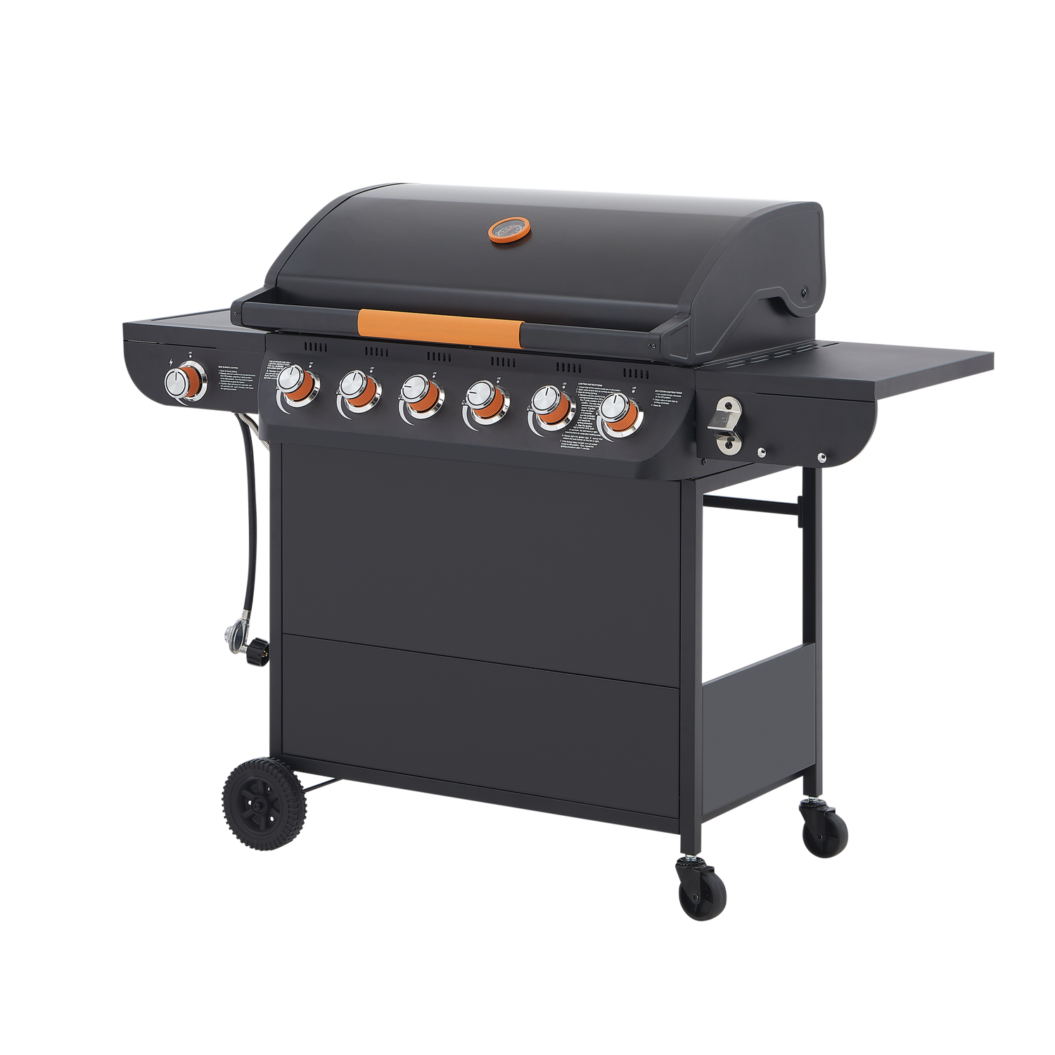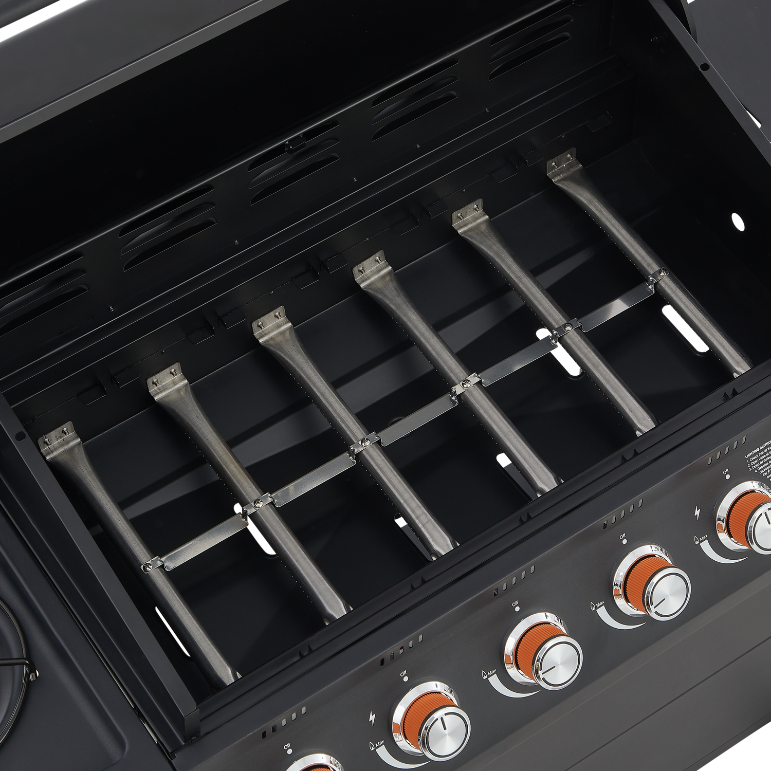 • This outdoor gas grill features 6 main burners and 1 side burner, delivering a total of 72000 BTU; Perfect for searing steaks and cooking with pots and pans, The piezoelectric ignition ensures easy startup.