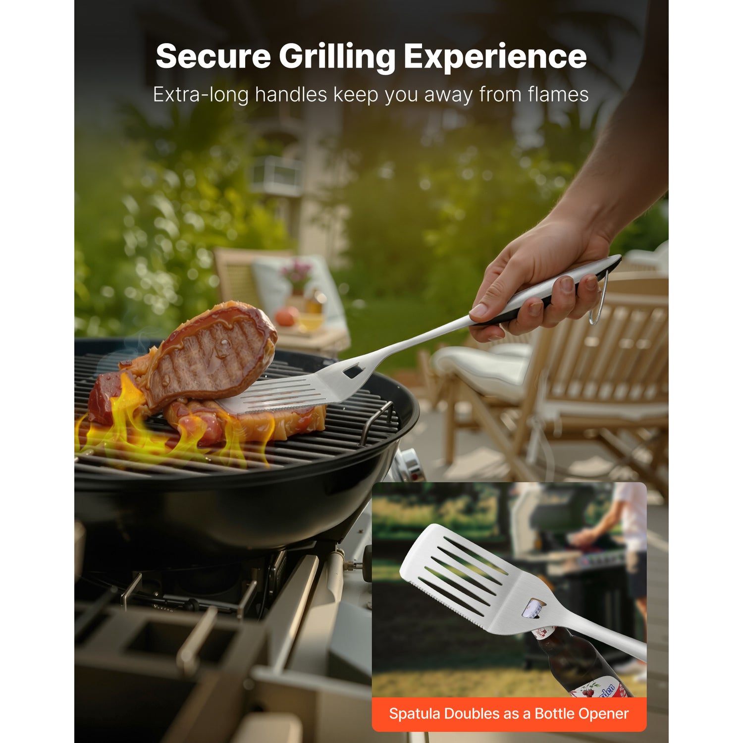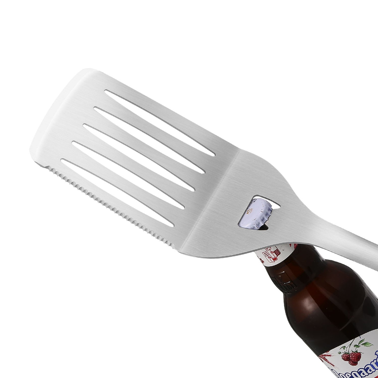 • 3-in-1 Spatula: Serrated edge for precise meat cutting; Bottle opener for practical experience; Wide spatula surface for easy flipping. Multiple functions combined to improve grilling efficiency and enjoyment