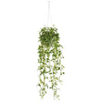 To bring your garden indoors, hang this artificial green variegated wandering jew in your home. A good choice to open up and brighten any living space, the green leaves spill out like a waterfall from a simple, clean white hanging basket.