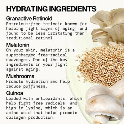 Melatonin: In your body, melatonin makes you sleepy. On your skin, melatonin stimulates the production of antioxidant enzymes while you sleep to protect against free radicals from pollution + UV rays.