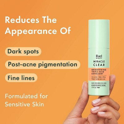 Rael’s Miracle Clear Brightening Triple Acid Exfoliant helps you achieve instantly brighter, smoother skin in as little as 3 minutes. The innovative cushion gel formula expedites cell turnover with a blend of 15% AHA, BHA, and PHA, gently exfoliating for a more even skin tone and reducing the appearance of dark spots. Three different weights of Hyaluronic Acid provide immediate hydration, plumping the skin to reduce the appearance of fine lines. Made with clean ingredients and safe for sensitive skin.