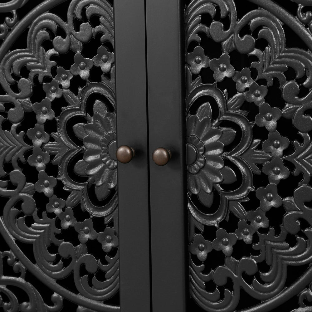 - Features symmetrical floral openwork carvings on solid wood doors and antique brass handles