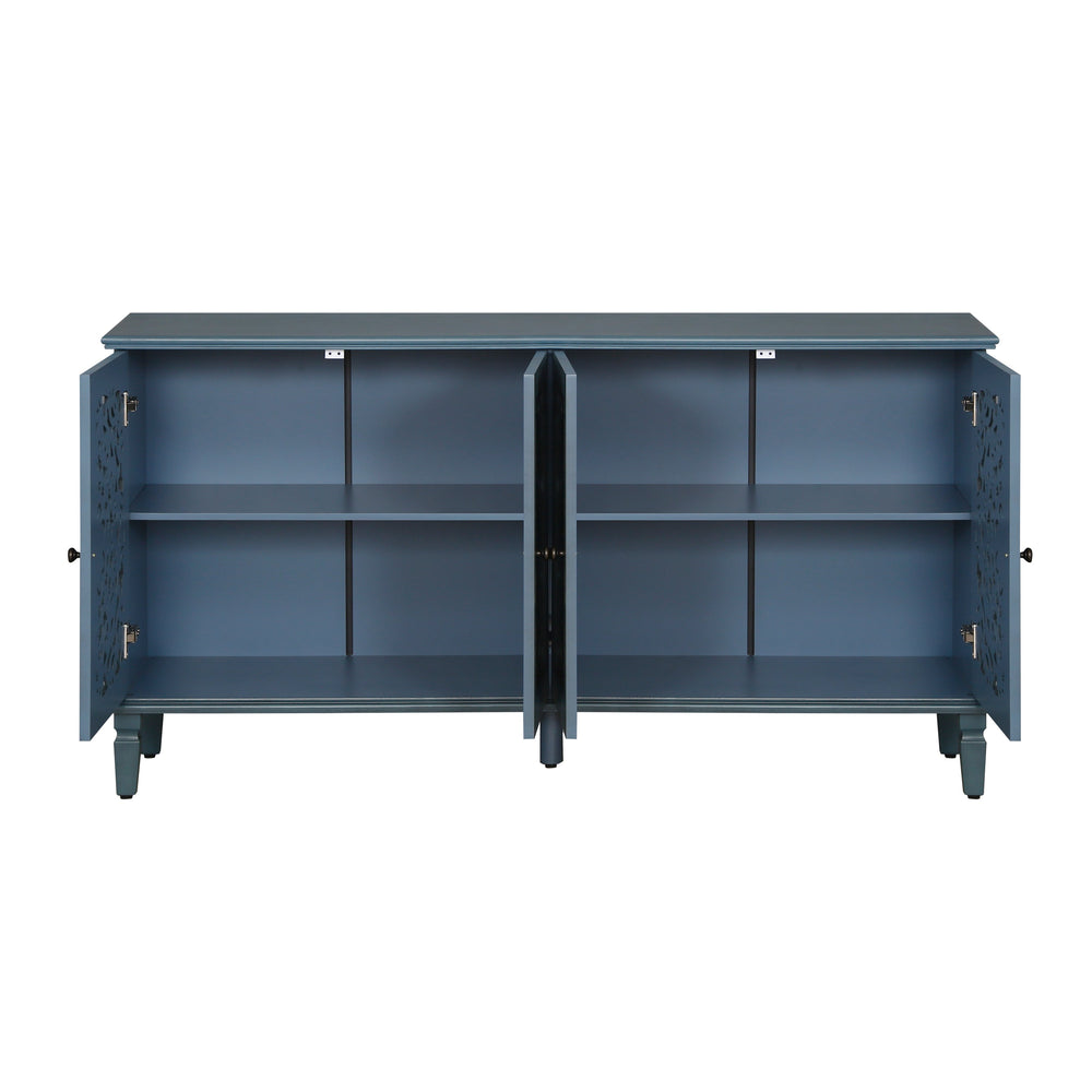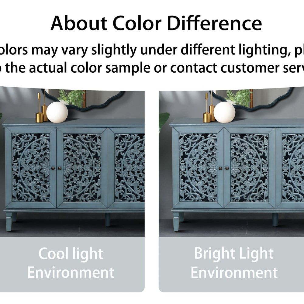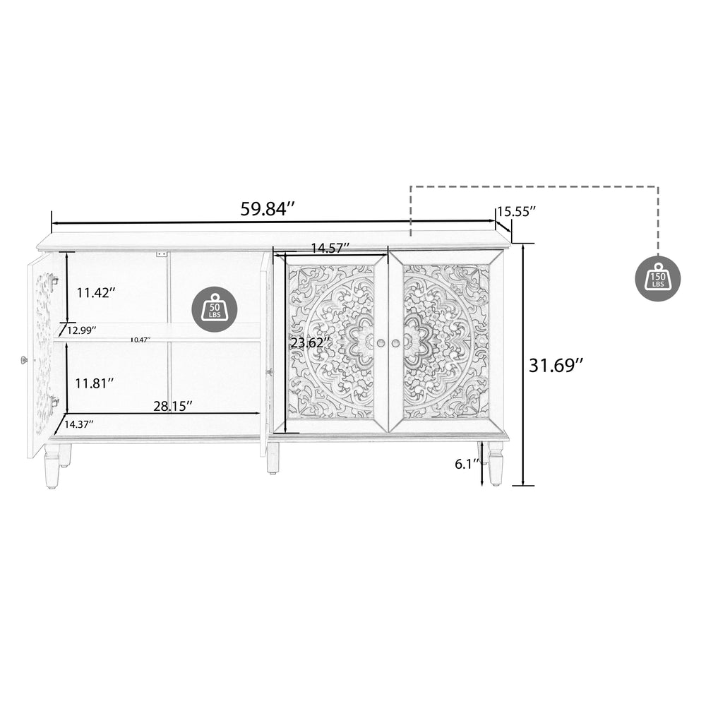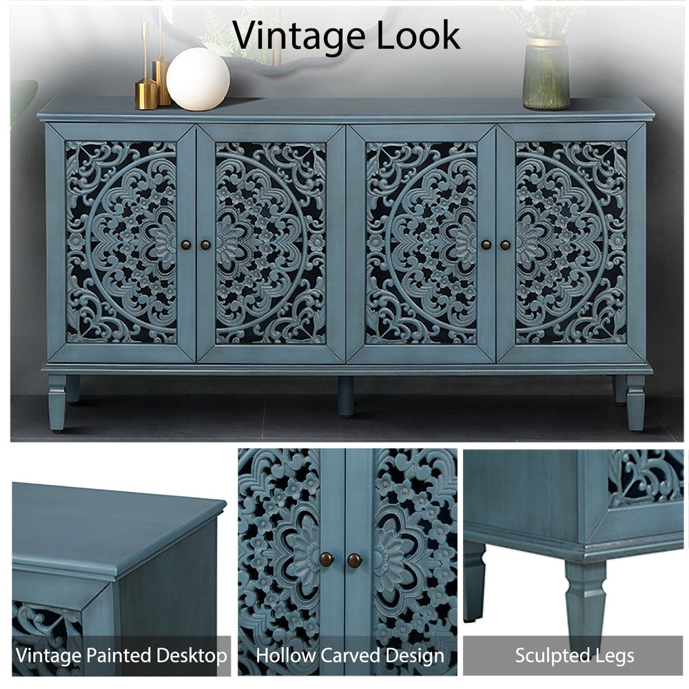 This 60" antique buffet cabinet features floral carvings and fits perfectly in living rooms or dining areas as a media console or sideboard. It combines classic style with versatile storage and display options.