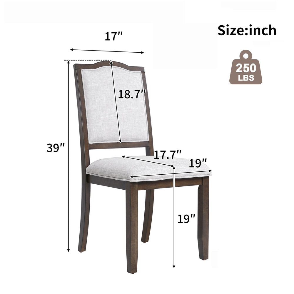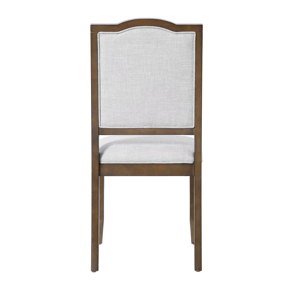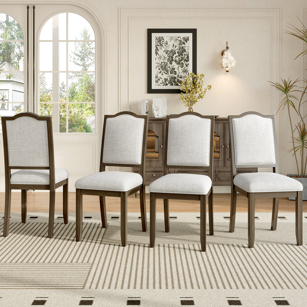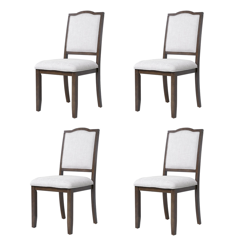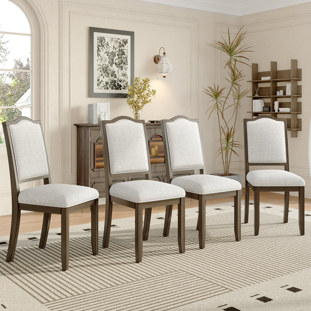 This set of four farmhouse dining chairs provides comfortable and stylish seating for your kitchen, dining room, or living space. Featuring a high, curved back upholstered in linen, these chairs offer a blend of classic and contemporary design.