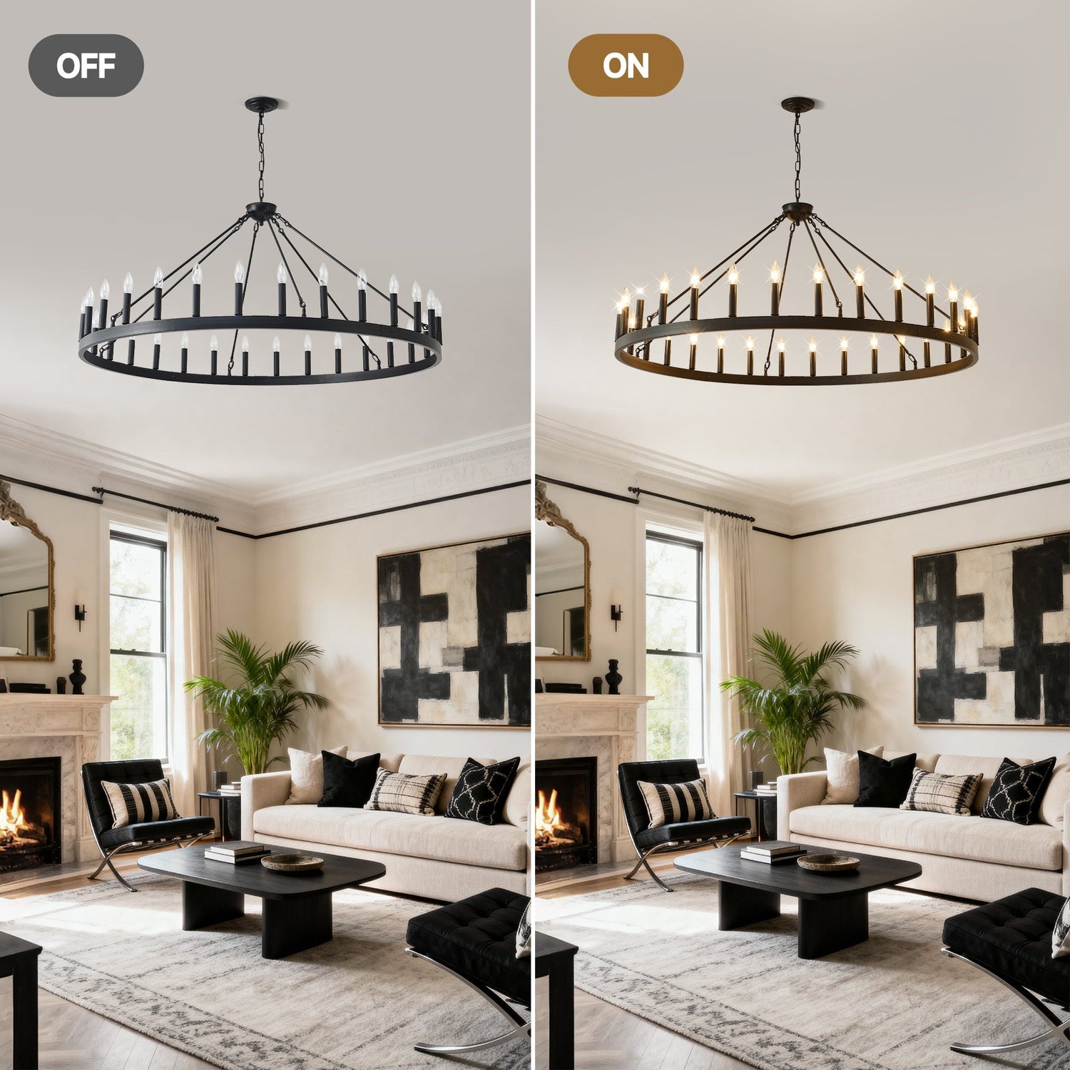 This 53.15 inch matte black wagon wheel chandelier is a ceiling light fixture designed for living rooms, dining rooms, kitchens, and bar areas. It blends vintage industrial style with modern farmhouse aesthetics to offer functional lighting and timeless decor appeal.