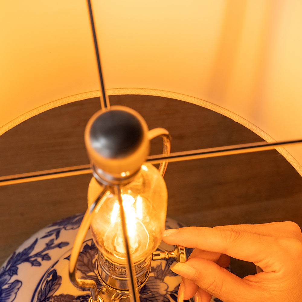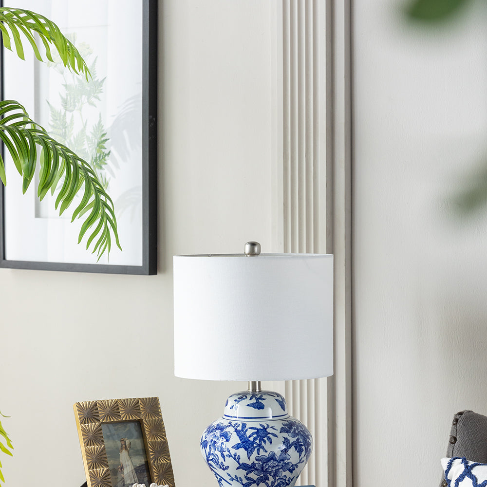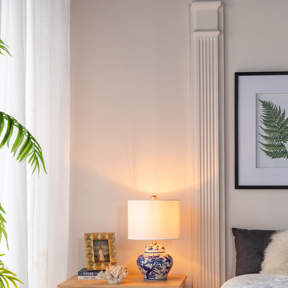 This ceramic vase lamp showcases a blue and white urn silhouette, ideal for providing ambient lighting with style in bedrooms, living rooms, or workspaces.