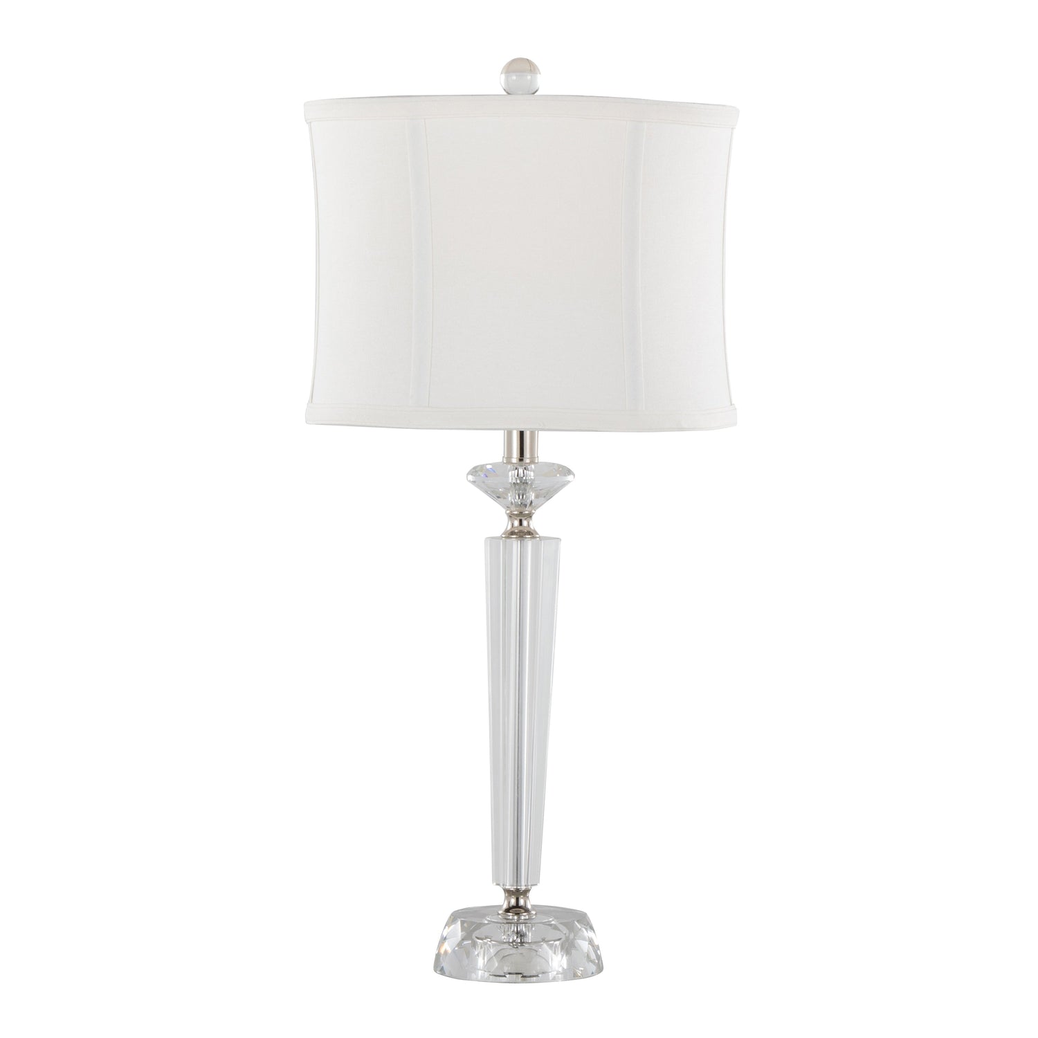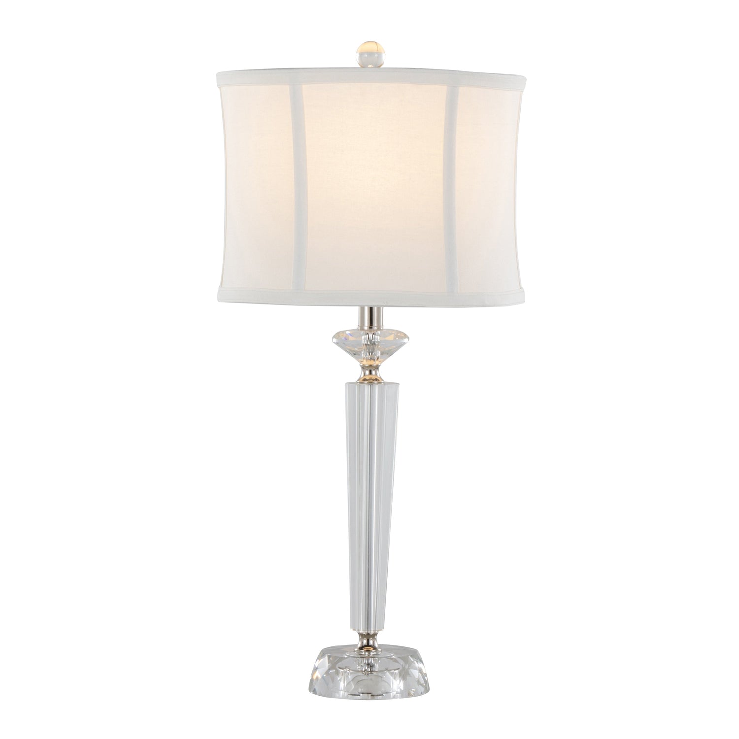 - Off-white linen drum shade topped with a crystal finial for a modern aesthetic