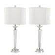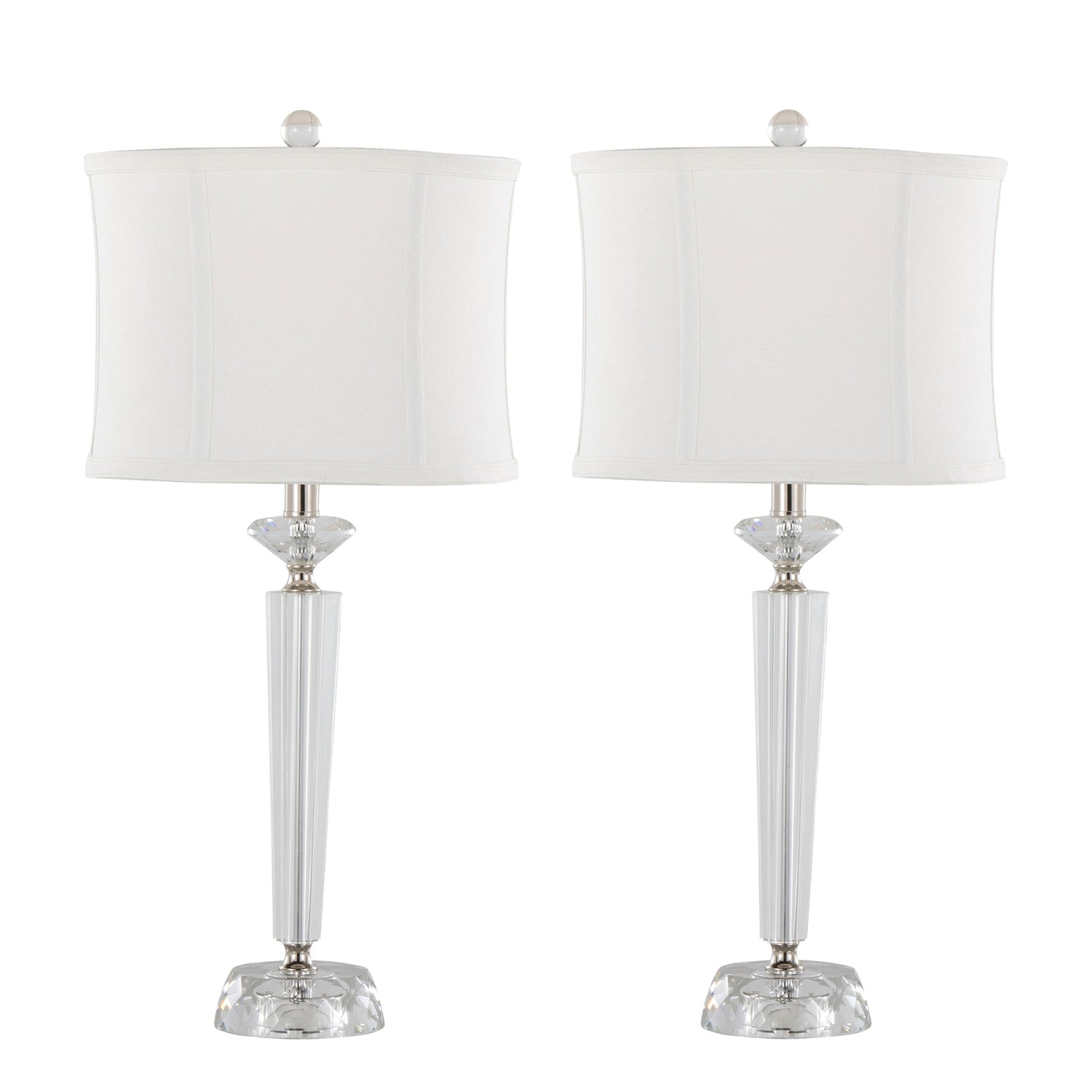 The Diamond Torch Table Lamp set includes two contemporary lamps perfect for enhancing bedrooms, living rooms, or offices with elegant indoor lighting. They feature crystal bases paired with linen drum shades for a refined and modern style.