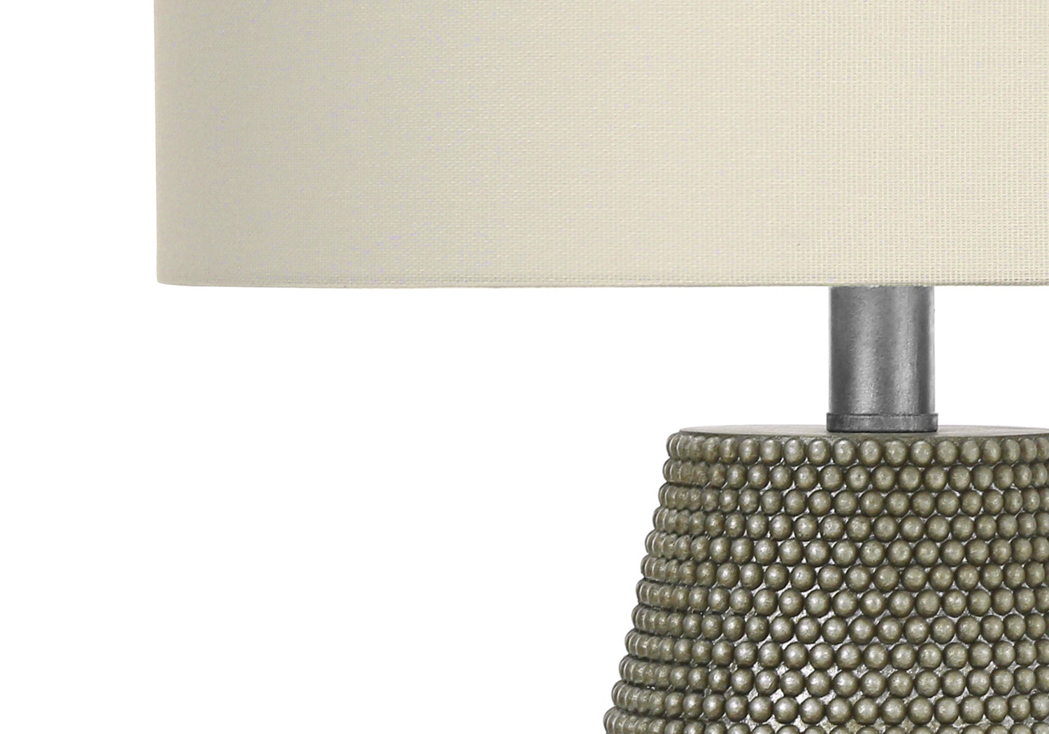 This 24-inch contemporary table lamp features a grey resin base with a raised dotted texture and an ivory fabric drum shade, ideal for adding style and adjustable lighting to living rooms, bedrooms, entryways, or home offices.