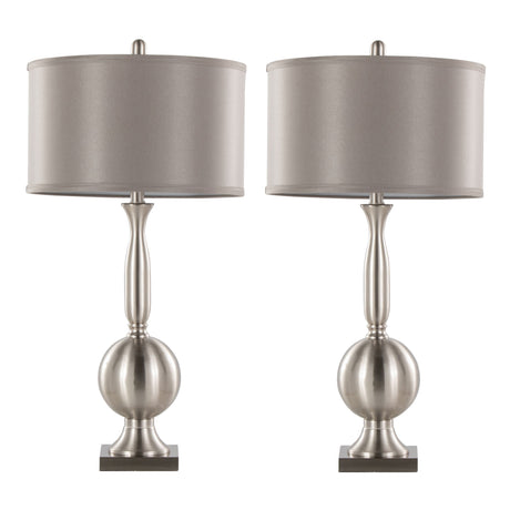 Joan 30" Contemporary Metal Table Lamp Set in Brushed Nickel with Grey Satin Shade - Set of 2