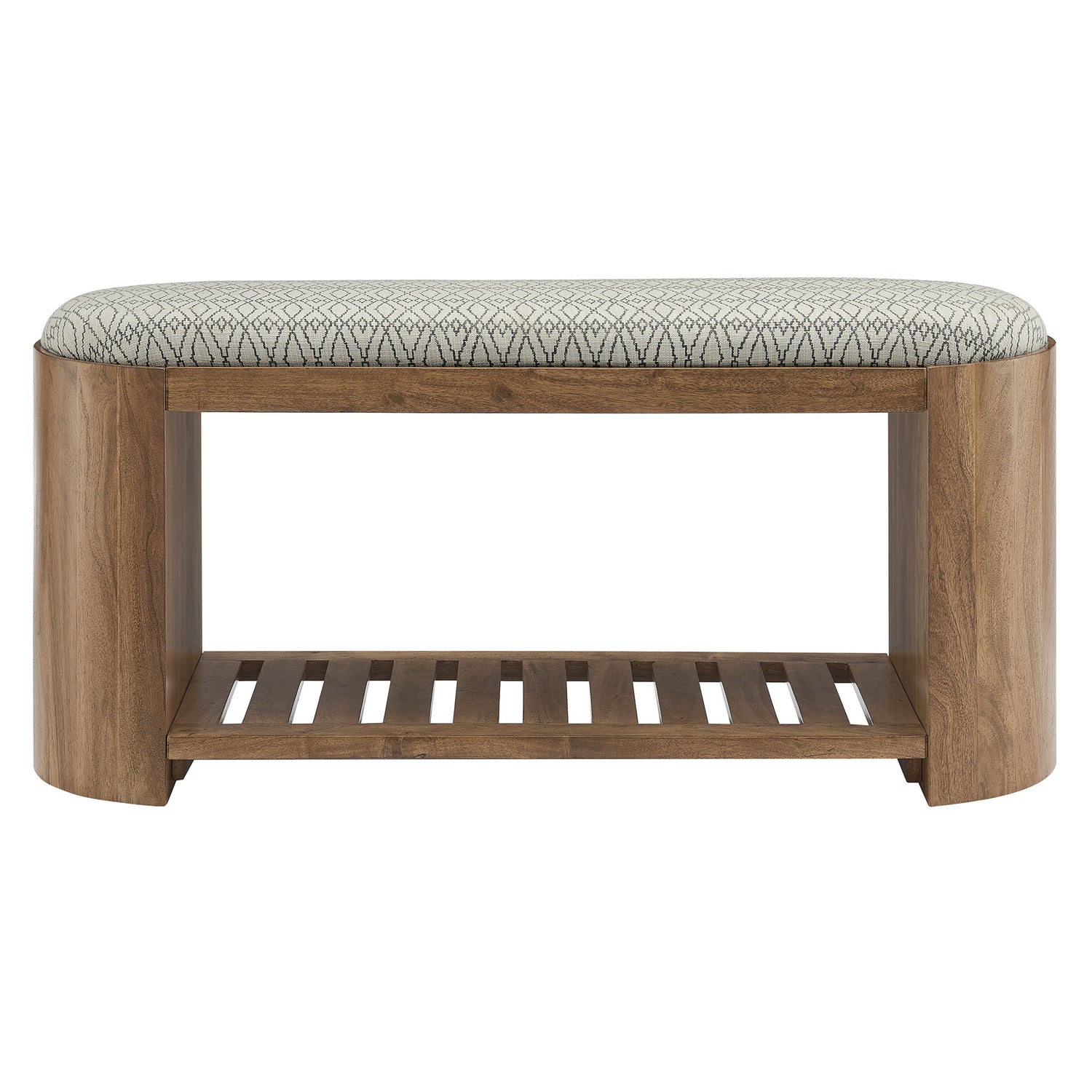 Bring style and function to your home with the Ashby Upholstered Bench, a versatile piece designed to enhance any entryway, bedroom, or living room. Crafted from solid acacia wood, this 45-inch bench features a rustic geo pattern upholstered fabric seat with dense foam padding for exceptional comfort. The slatted bottom shelf offers a convenient place to store shoes, bags, or other essentials, making it perfect for entryways or mudrooms. With rounded edges and corners, the Ashby Modern Bench adds a soft, contemporary aesthetic with functional use to any living space. Assembly is required, and adjustable levelers provide stability on uneven floors. Whether used as a seating bench or a stylish storage solution, this wood bench combines modern design with practical functionality. Weight Capacity: 200 lbs.