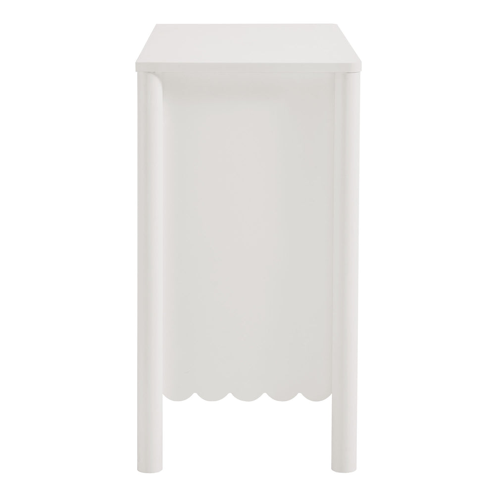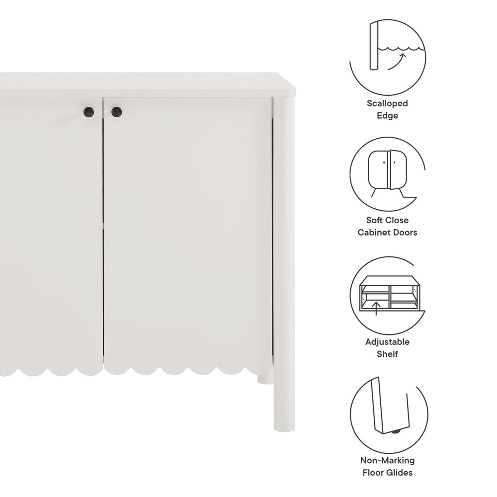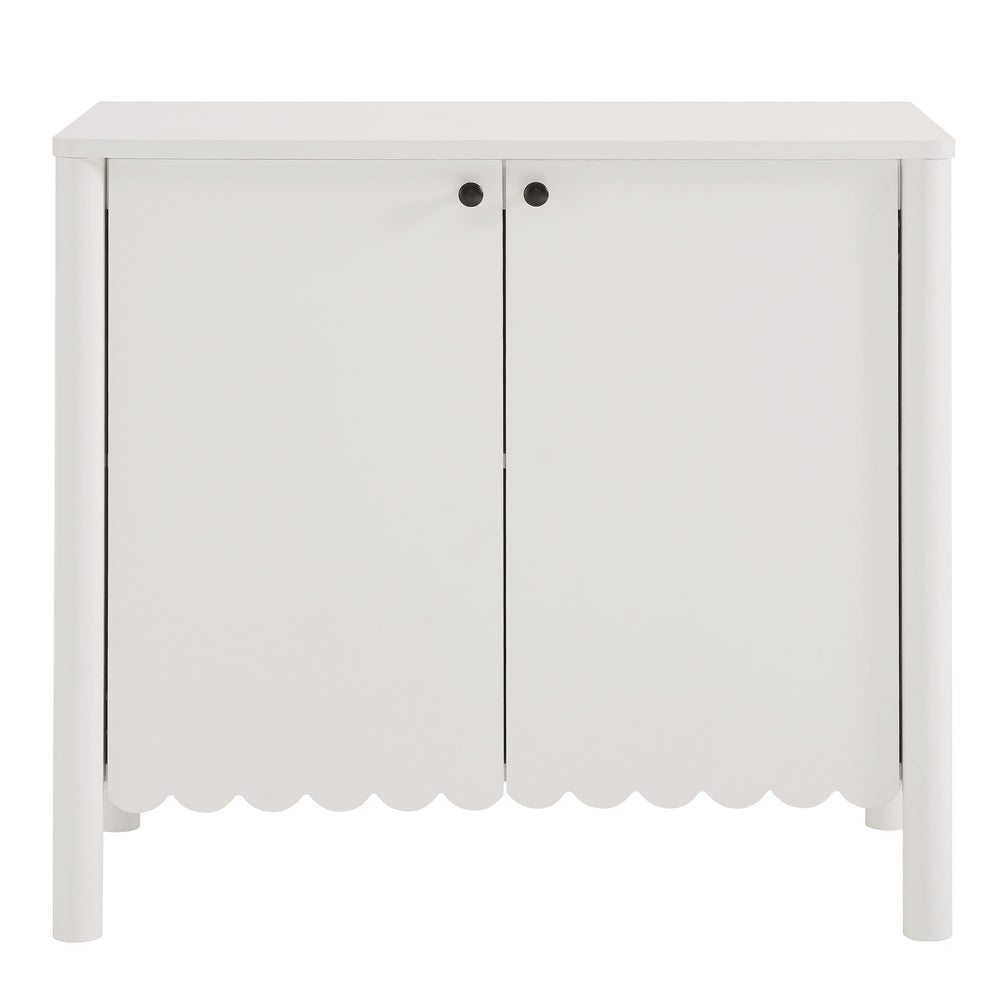 An elegant blend of subtle curves and practical storage, the Emmeline 2-Door Wavy Sideboard Cabinet adds a touch of artistic flair to any room. Its standout feature — scalloped bottom edge — creates a soft, flowing silhouette that enhances the modern simplicity of the design. Behind its two soft-close doors, an adjustable shelf provides flexible storage space, ideal for organizing dining essentials, decor, or media accessories. Crafted with a sturdy frame and finished in smooth laminate, this farmhouse side cabinet is as functional as it is stylish. The round door knobs and non-marking glides add to its refined appearance, while ensuring your floors remain protected. Whether serving as a modern sideboard, accent cabinet, or entryway console with storage, Emmeline brings a contemporary, polished look to hallways, dining rooms, or living spaces. Assembly required.