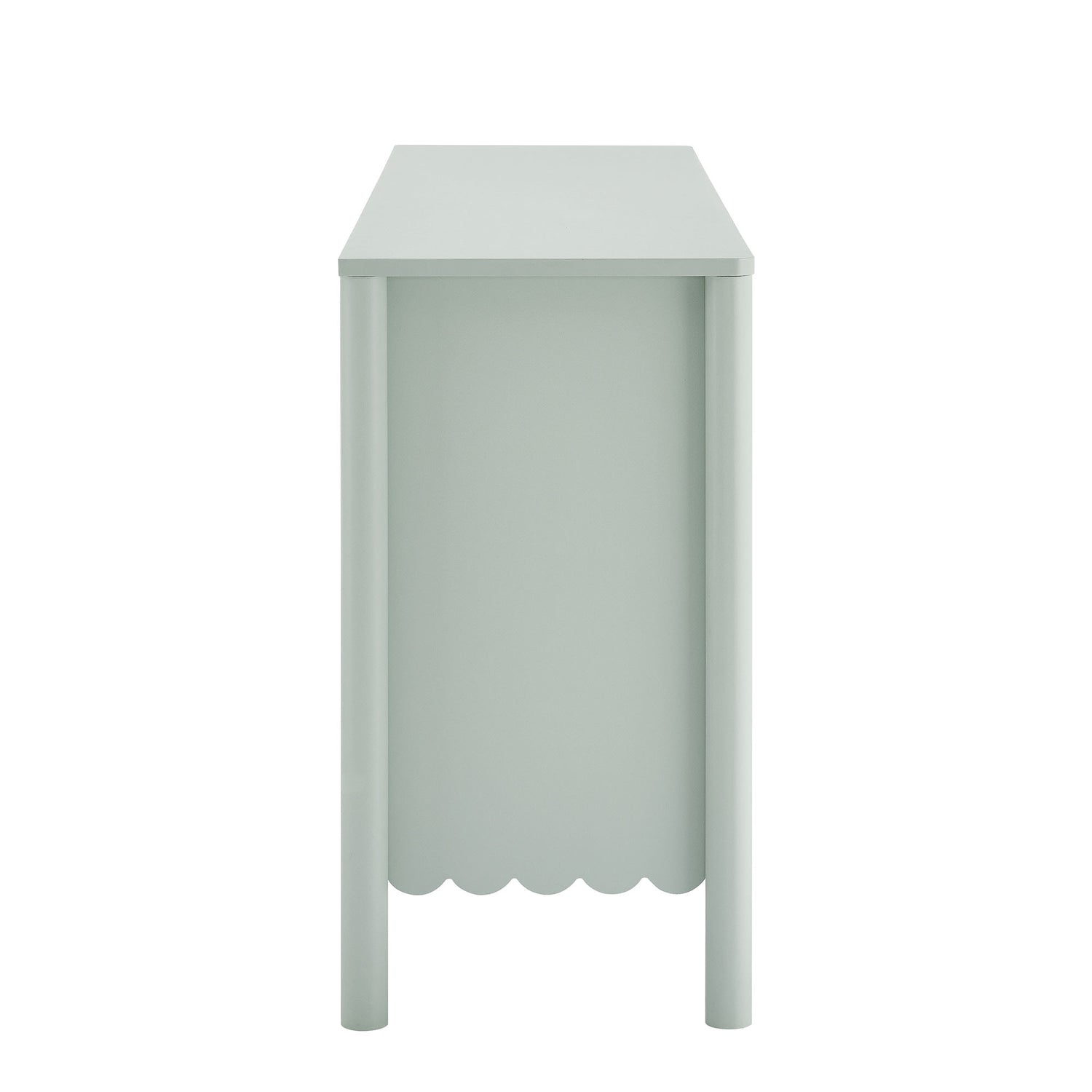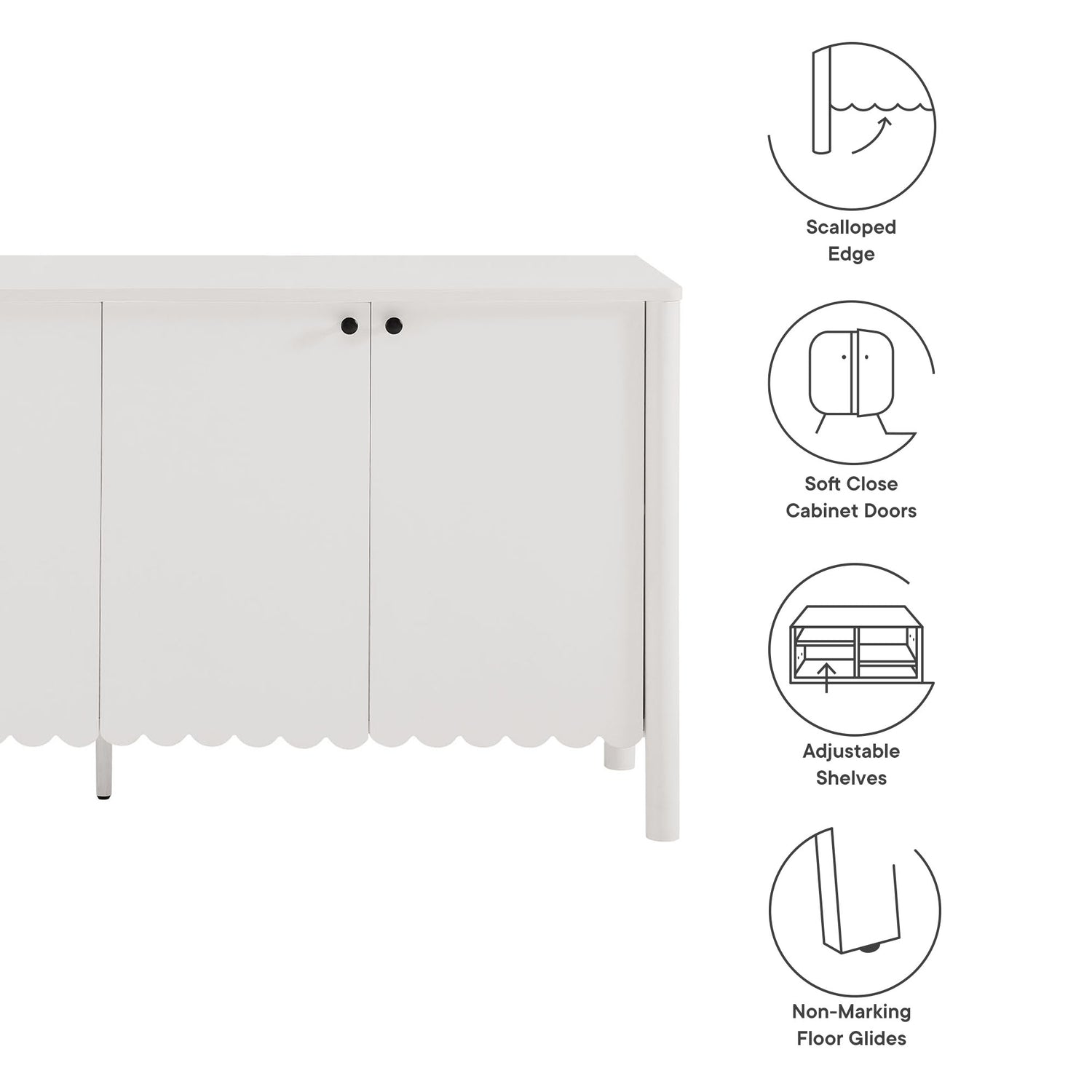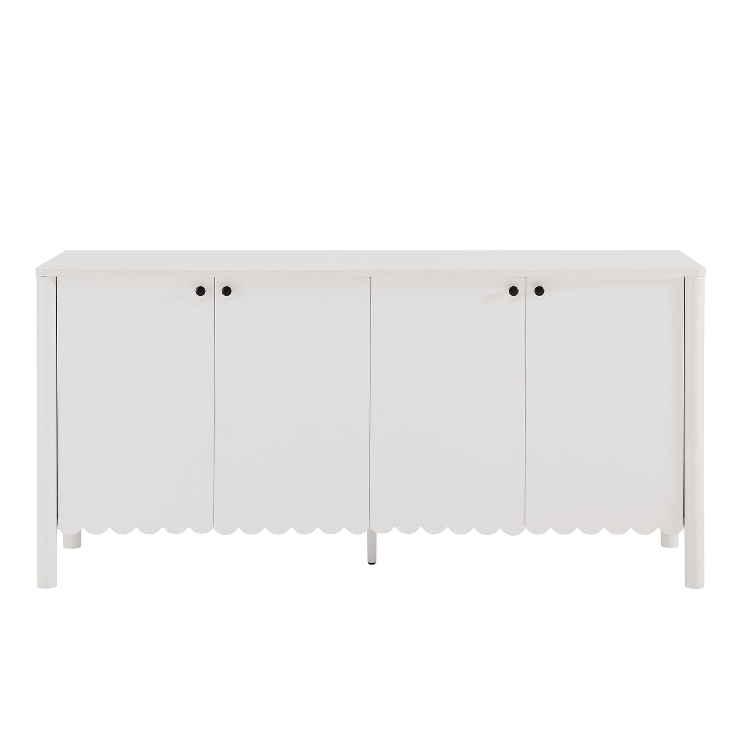 An elegant blend of subtle curves and practical storage, the Emmeline 4-Door Wavy Sideboard Cabinet adds a touch of artistic flair to any room. Its standout feature�a scalloped bottom edge�creates a soft, flowing silhouette that enhances the modern simplicity of the design. Behind its four soft-close doors, adjustable shelves provide flexible storage space, ideal for organizing dining essentials, decor, or media accessories. Crafted with a sturdy frame and finished in smooth laminate, this wide farmhouse sideboard is as functional as it is stylish. The round door knobs and non-marking glides add to its refined appearance, while ensuring your floors remain protected. Whether serving as a modern sideboard, accent cabinet, or entryway console with storage, Emmeline brings a contemporary, polished look to hallways, dining rooms, or living spaces. Assembly required.