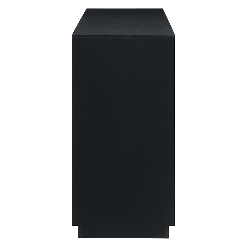 Merge sophistication and utility with the Holden 47 Sideboard. Constructed from MDF and durable particleboard, this sideboard features a wood grain laminate on its cabinets and drawers, bestowing a rustic flair that complements any contemporary setting. Experience modern convenience with push-to-open cabinetry and thoughtfully designed shelving behind three hinged doors. Complete with three full-glide drawers, and resting on a sleek plinth base, the versatile storage solutions of Holden's design allow it to serve as a fashionable buffet table, an urban-chic sideboard, or high TV stand supporting flat screen TVs up to 52". Assembly Required. Weight Capacity: 145 lbs. Please Note: When placing the TV directly on the unit, we recommend anchoring it in place.