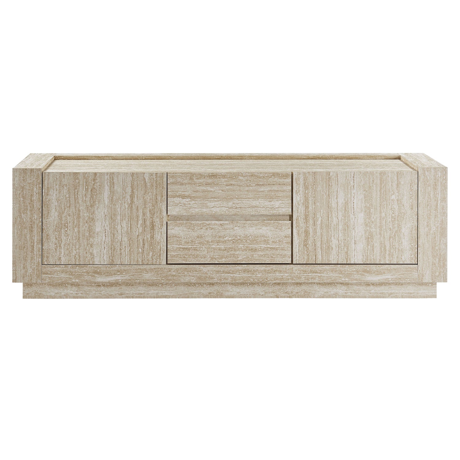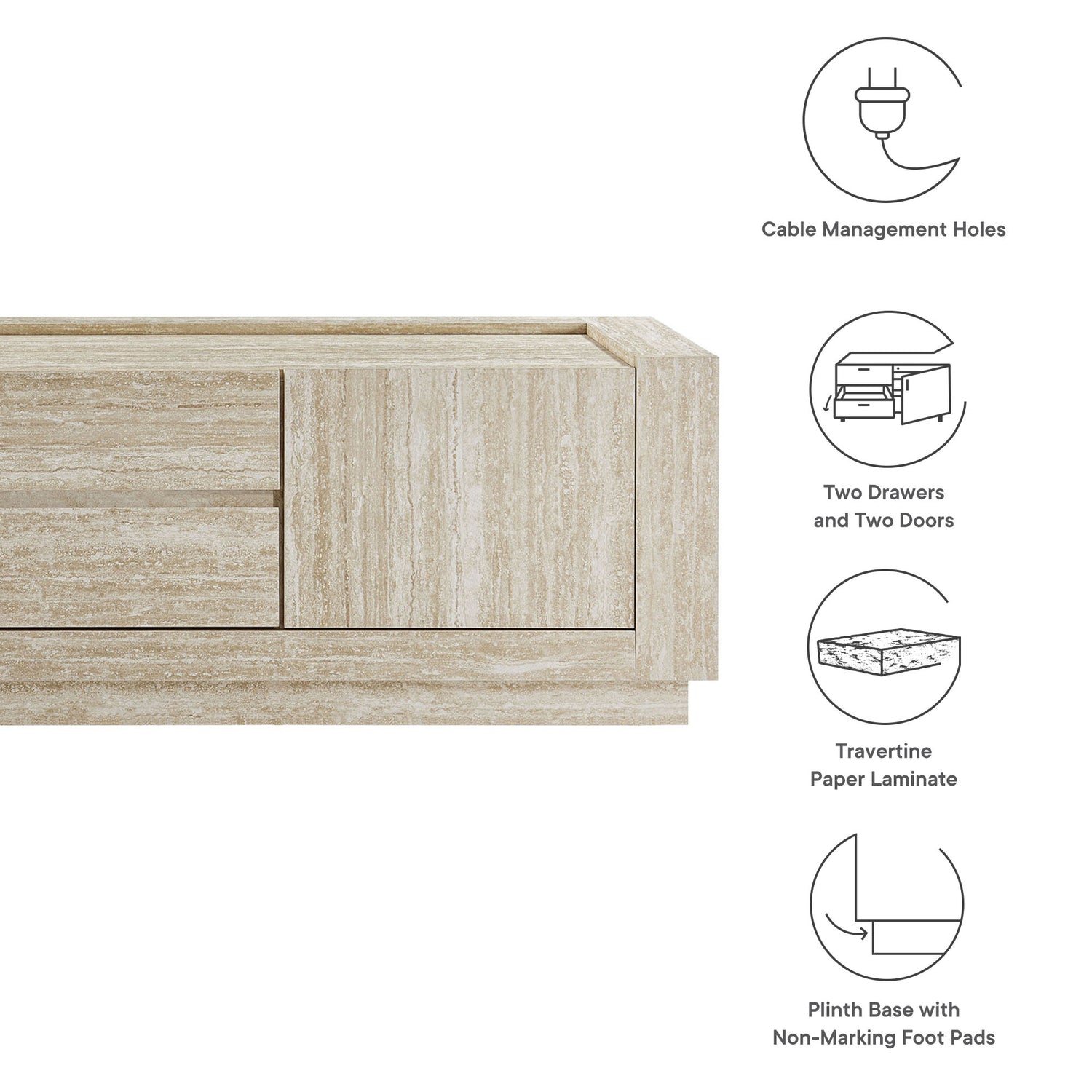 Bring a fresh look to your home with the Hollis Modern TV Stand, a 59-inch media console designed to balance functionality and style. Featuring a sleek travertine laminate finish, this TV stand provides ample storage for all your media essentials and serves as a stylish TV cabinet for your wall-mounted TV. It has 2 doors and 2 drawers, with the interior featuring fixed shelving and deep drawers, allowing you to store electronics, media equipment, or decor with ease. The Hollis low profile TV stand provides versatile storage options while maintaining a clean and contemporary look. Its plinth base and non-marking foot pads ensure stability and floor protection, creating a beautiful entertainment center that complements your home�s decor. This floor TV cabinet is the storage solution you need every day to keep your space tidy and organized. Top Panel Weight Capacity: 271 lbs, Shelves: 44 lbs.