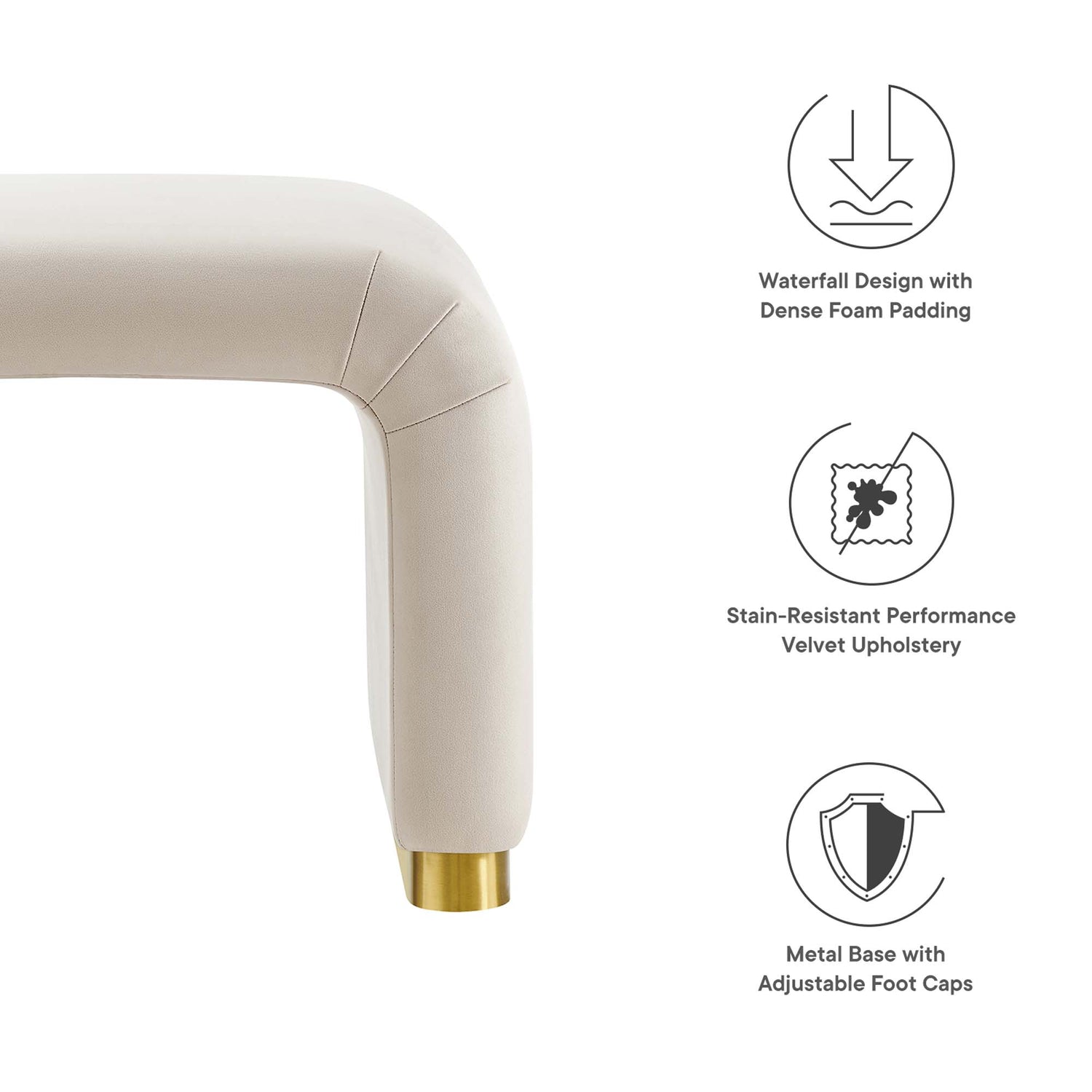Let the Koda Performance Velvet Stool redefine your space with its style and adaptability. Crafted with a sturdy plywood frame, this backless stool exudes a soft and flowing silhouette. Koda features stain-resistant performance velvet upholstery and a unique waterfall design. This multifunctional piece serves as both a chic stool and a fashionable side table, effortlessly blending classic design with a touch of contemporary allure. The dense foam padding ensures a comfortable experience, whether as extra seating, a stylish surface, or a statement piece in your living room, lounge, or hallway. The Koda Upholstered Stool stands elegantly on a solid metal base with non-marking adjustable foot caps, ensuring stability while protecting your flooring. Assembly Required. Weight Capacity: 331 lbs.