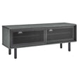 Bring urban flare to your living space with the modern design of the Kurtis 47" TV Stand. Featuring sliding metal mesh doors, this entertainment center brings industrial design to the living room, bedroom, home office, or lounge area. This media stand is crafted from MDF and particleboard with a natural wood grain design. Offering ample storage space for all your media essentials, this TV console features an open shelving area concealed by mesh sliding doors with cable management holes that keep things organized and allow for flow through ventilation. Resting on sturdy wood legs with non-marking foot pads to protect flooring, this low-profile TV stand accommodates flat screen TVs up to 52 inches. Assembly required. Weight Capacity: 137 lbs.