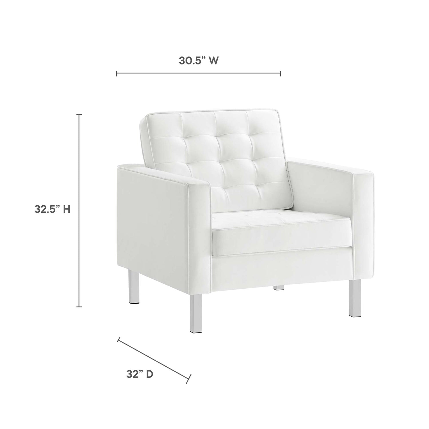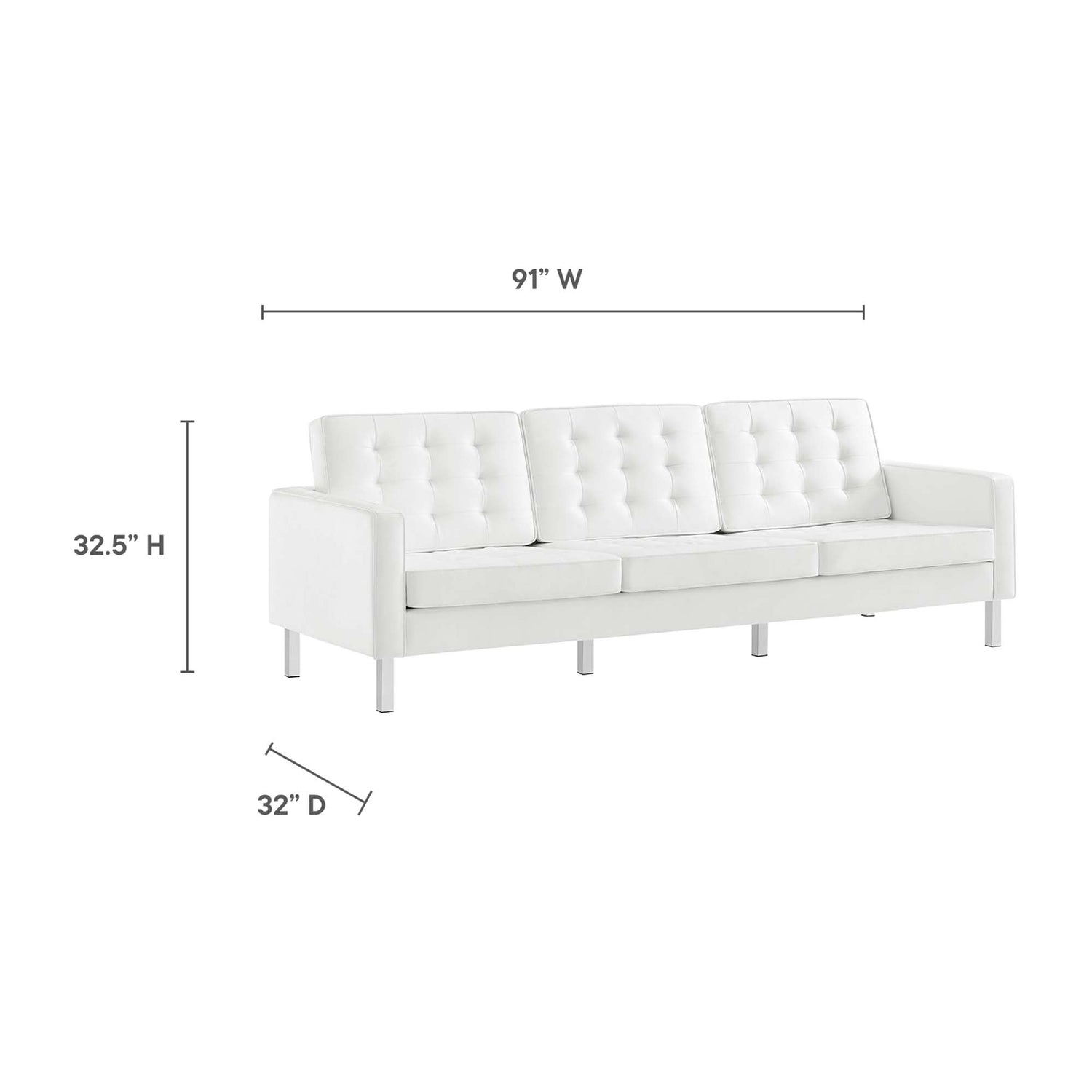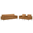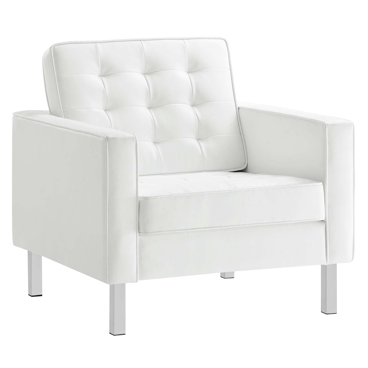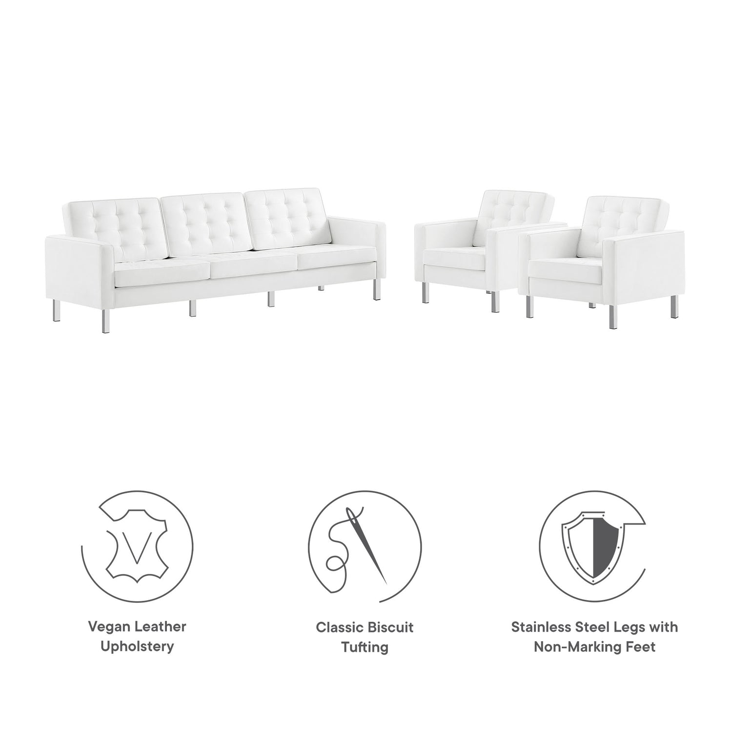 Revolutionize your living room furniture with the iconic Loft Vegan Leather Furniture Set. Adding visual depth to your living room or lounge space, Loft features soft and durable vegan leather upholstery accented with classic biscuit tufting. This modern living room furniture set showcases a captivating linear design, tubular stainless steel legs, and non-marking foot caps that protect flooring. Inspired by the richness of mid-century modern style, this stylish furniture set is an ideal choice for living rooms, office reception areas, and lounge spaces. Assembly required. Set Includes: 2 Armchairs, 1 Sofa
