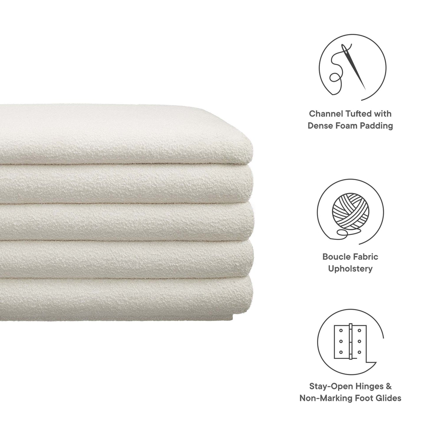 Elevate your home�s comfort and elegance with the Mezzo Boucle Upholstered Storage Ottoman. Padded with dense foam and wrapped in a nubby textured boucle fabric, this storage bench for the living room or bedroom is as practical as it is striking with its plush channel tufted detail. The stay-open hinge adds convenience, revealing a spacious storage area ideal for stowing linens, games, home accents, and more. Perfectly suited as a storage bench for the entryway or as a chic bed bench, Mezzo offers versatile use with its non-marking floor glides to protect your surfaces. Its robust design, coupled with the nubby texture of boucle, makes it a centerpiece in any room. Arriving fully assembled, this bedroom bench saves you time and effort, allowing you to instantly enjoy its splendor and spacious utility. Weight Capacity: 617 lbs.