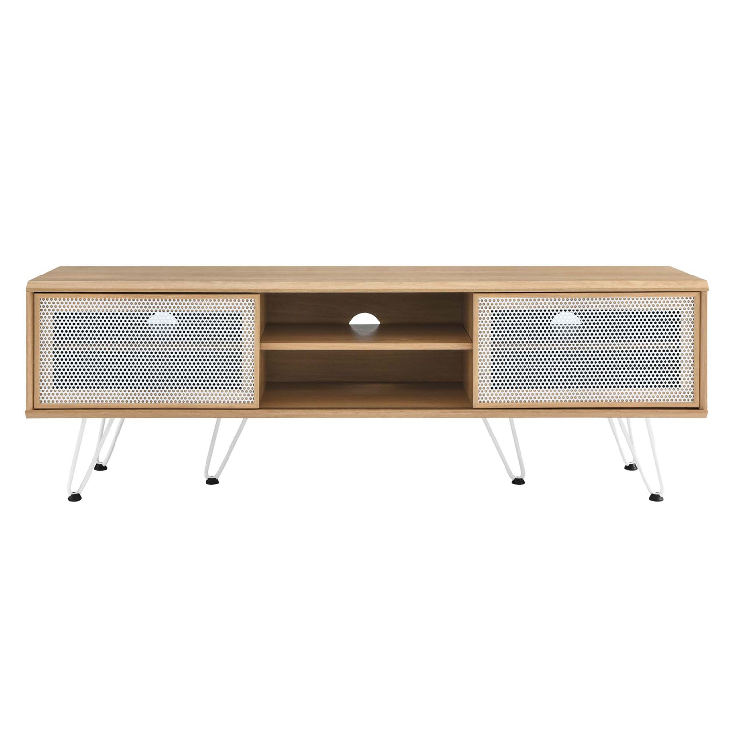 Urbanize your living space with the modern style of the Nomad 59" TV Stand. Featuring two sliding metal mesh doors, this entertainment center brings organic aesthetics and industrial design to the living room, bedroom, home office, or lounge area. This media stand is crafted with a honeycomb core and wood grain laminate. Resting on splayed hairpin legs with non-marking rubber pads, this media stand offers ample storage space for all your media essentials with spacious shelving while cable management holes keep visual space clean and allow for flow-through ventilation. This TV center accommodates TVs up to 65". Assembly required. Weight Capacity: 200 lbs.