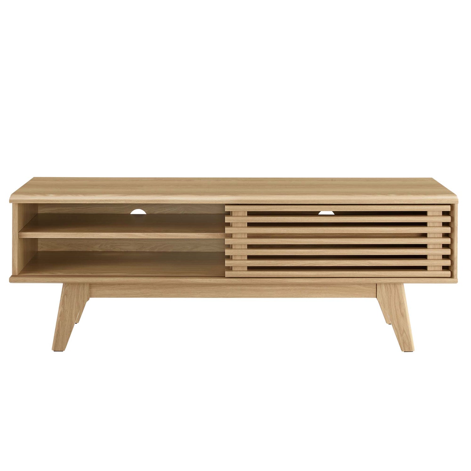 Tap into mid-century aesthetics with the Render 48� TV Stand. Render features a durable particleboard frame with smooth walnut grain laminate, four tapered wood legs, non-marking foam foot pads, and a slatted sliding door for sophisticated media storage. Complete with a cable management hole on both sides, Render�s contemporary linear style is the perfect addition to the modern living room, lounge or recreation area.