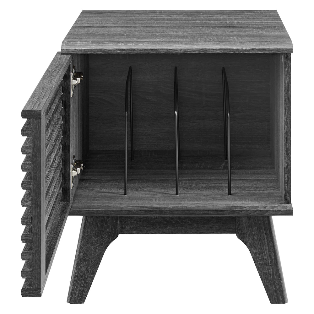 Tap into mid-century aesthetics with the Render Vinyl Record Display Stand. Render features a durable particleboard frame with walnut grain laminate, four tapered wood legs, non-marking foam foot pads, and a hinged slatted door with ample storage space for your vinyl record collection. Complete with metal dividers to keep records standing upright, Render�s contemporary linear style is the perfect addition to the modern living room, lounge space, bedroom, or recreation area.