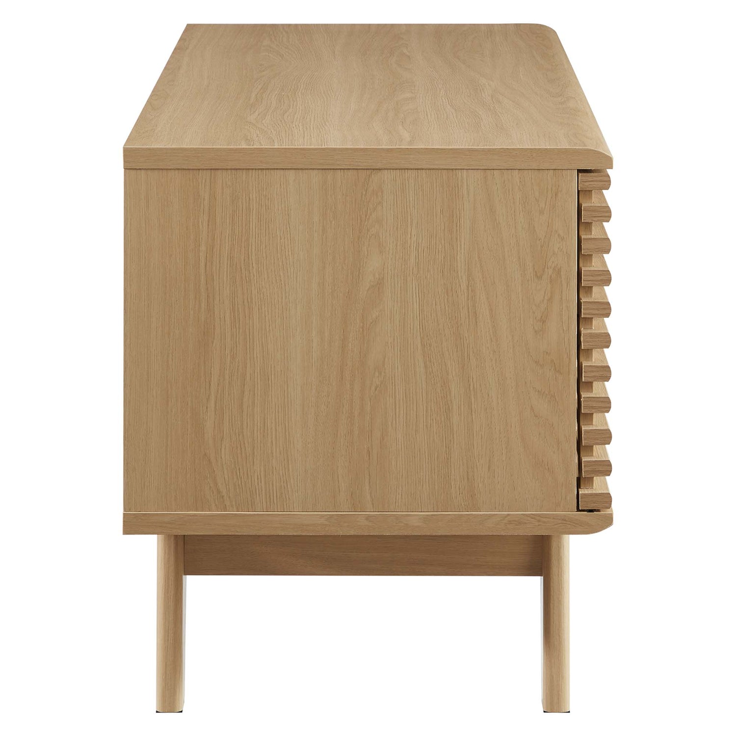 Tap into mid-century aesthetics with the Render Vinyl Record Display Stand. Render features a durable particleboard frame with walnut grain laminate, four tapered wood legs, non-marking foam foot pads, and a sliding slatted door with ample storage space for your vinyl record collection and media essentials. Complete with metal dividers to keep records standing upright, Render�s contemporary linear style is the perfect addition to the modern living room, lounge space, bedroom, or recreation area.
