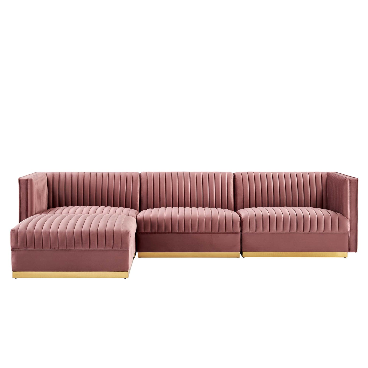 Glamour radiates from the organic linear design of the Sanguine Channel Tufted Performance Velvet Modular Sectional Sofa. Relax and follow the vertical channel tufting for a streamlined look that adds retro modern glamour to your living room, lounge, or home office. Soft, stain-resistant performance velvet upholstery creates a luxurious tactile experience while dense foam padding and an individually wrapped spring coil system provide ultimate comfort and support for this sectional sofa. Solidly constructed from eucalyptus wood and plywood, this sectional sofa is an eye-catching addition. Sanguine's palatial accents and premium comfort rest securely on a gold stainless steel base that complements any contemporary modern home or apartment. Includes non-marking foot pads to protect flooring and modular connectors. Each Seat Weight Capacity: 330 lbs.