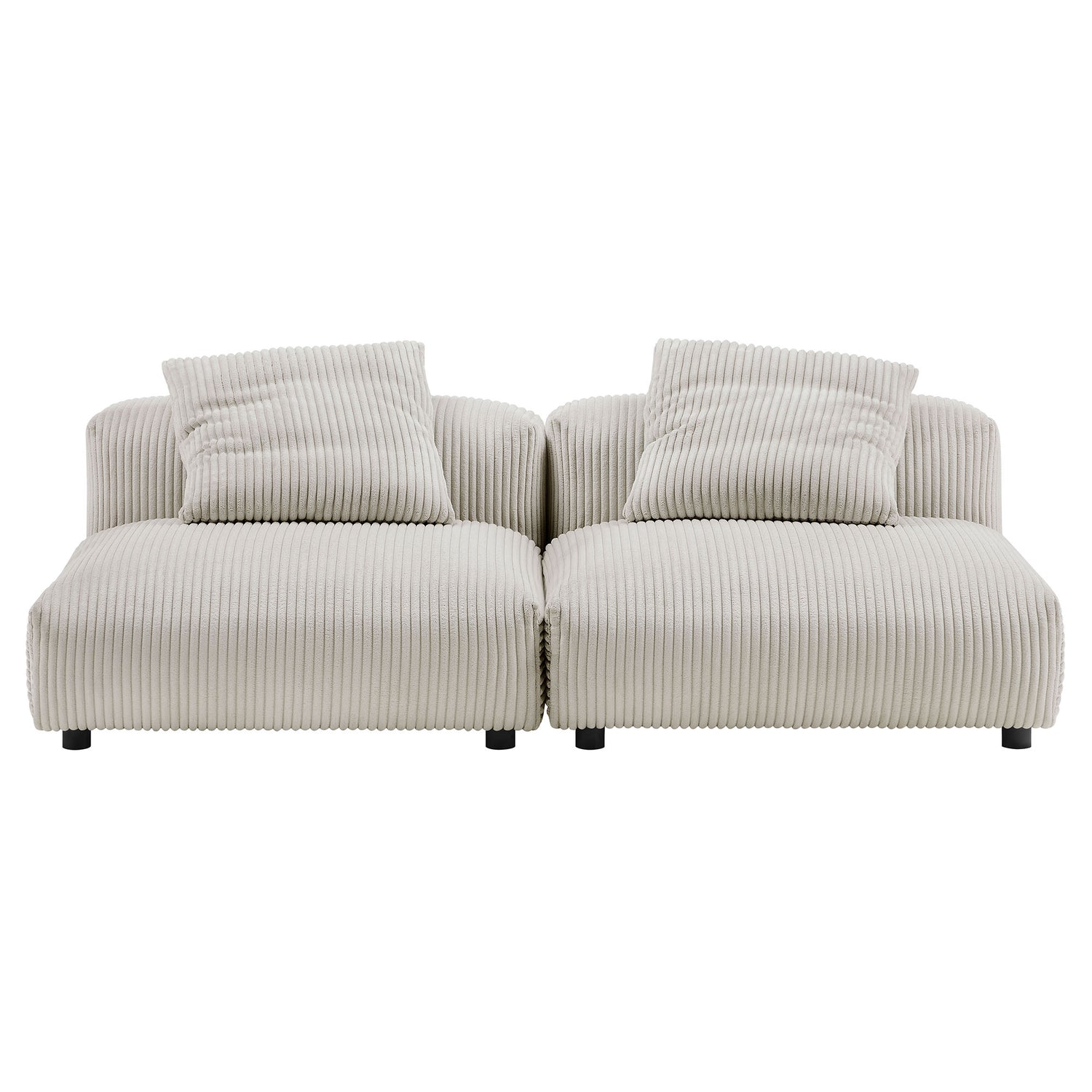 Revel in ultimate comfort and modern style with the Solace Modular Corduroy 2-Seater Sofa. This oversized corduroy sofa is perfect for any living room, offering endless flexibility. Its modular furniture design allows you to change the arrangement to suit the needs of the moment or expand your seating by adding more pieces in the future. Featuring a sturdy frame, dense foam padding, and a sinuous spring support system, the Solace 2-Piece Sofa grants a premium seating experience. The comfy corduroy upholstery adds a cozy, casual vibe, making this armless sectional sofa a perfect addition to any living space or lounge area. Equipped with non-marking plastic glides and complementing accent pillows, this armless modular couch is both stylish and practical. With no assembly required, you can enjoy immediate relaxation with this 2 piece living room set. Set Includes: 2 Armless Chairs