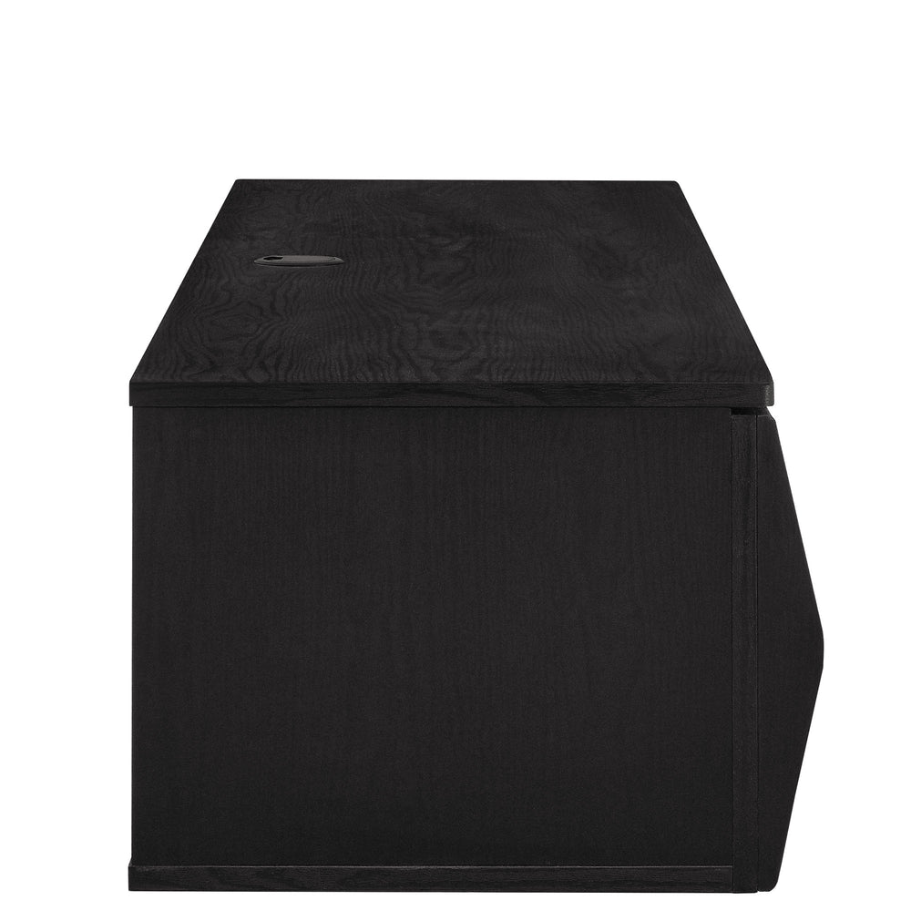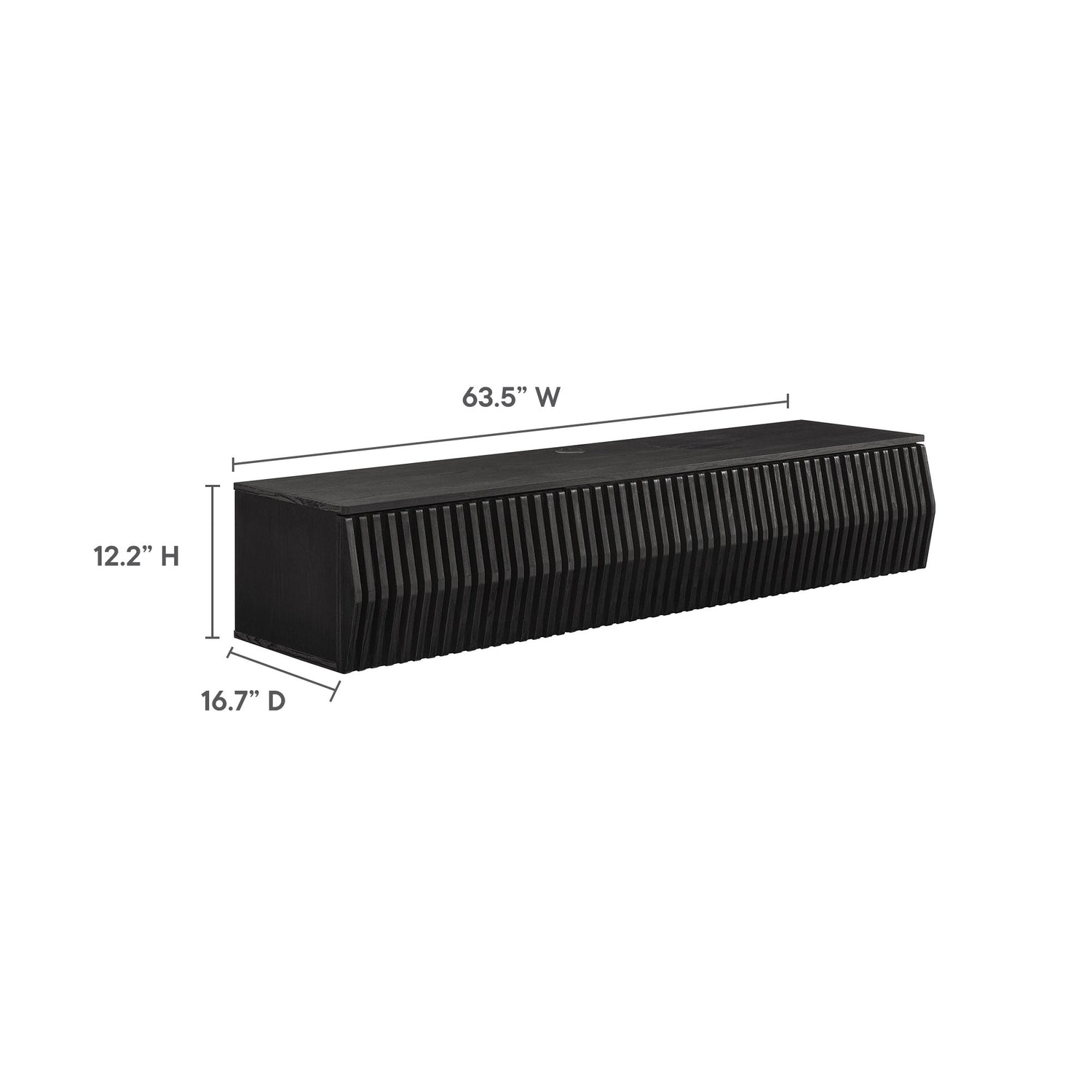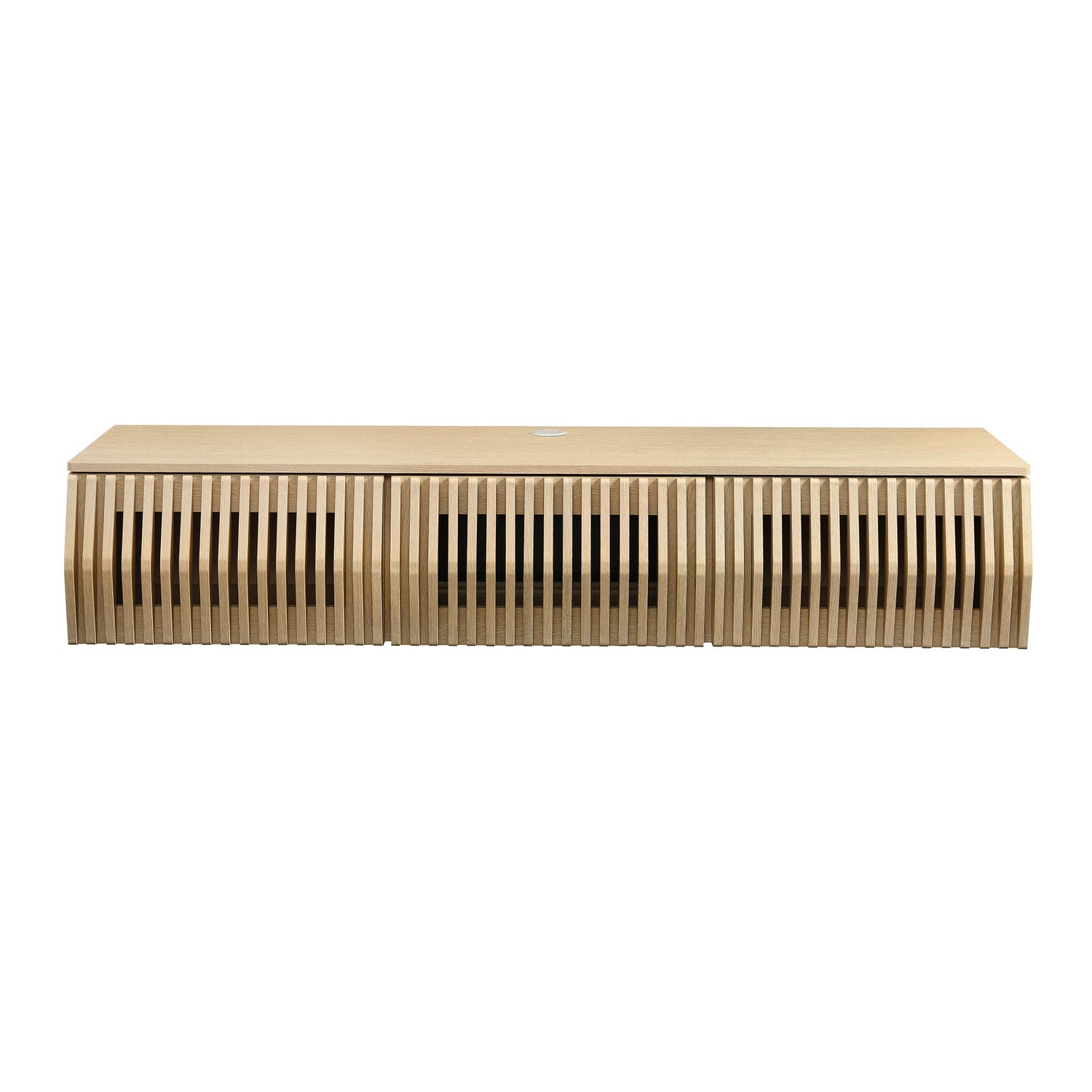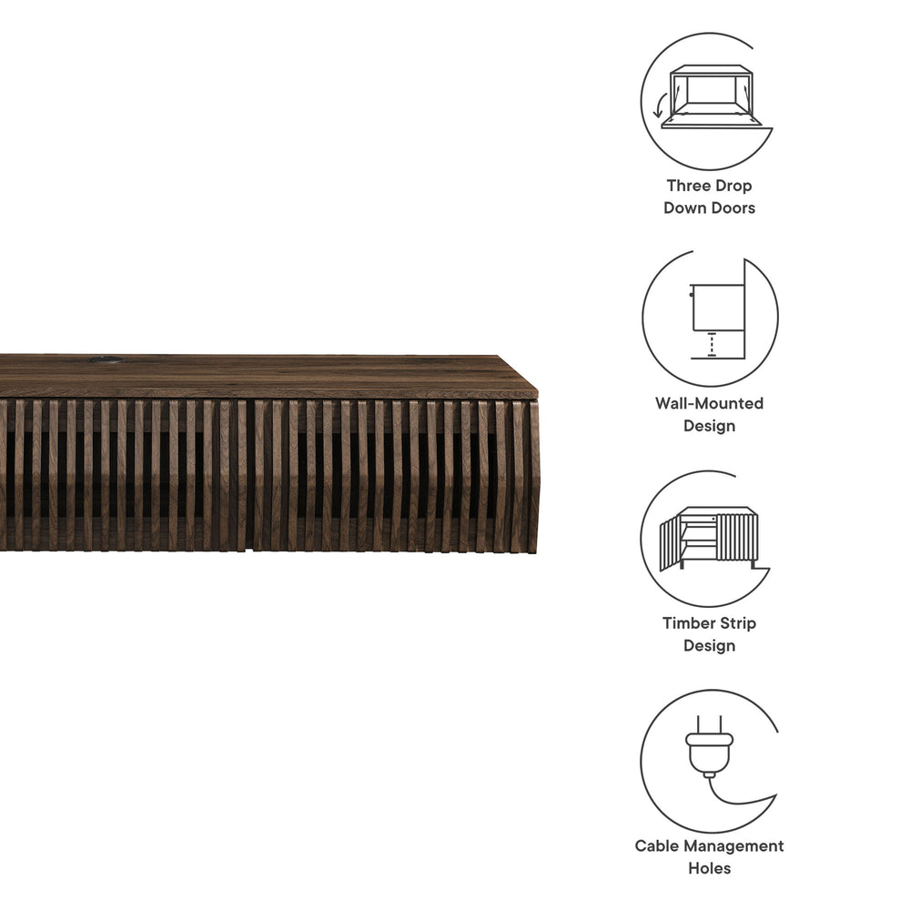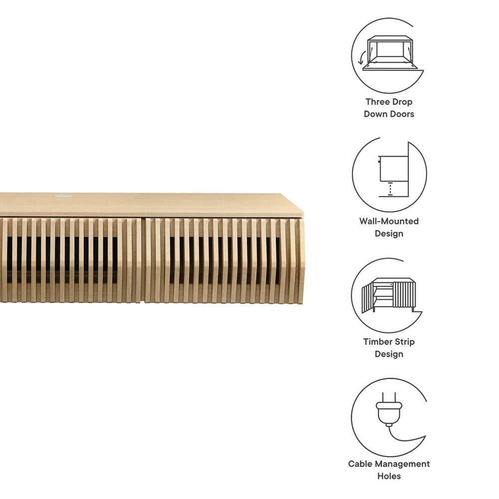 Immerse yourself in the minimalist and functional elegance of the Vaughn Wall Mounted TV Stand. Covered in a smooth laminate finish, this wall mounted TV cabinet provides a sophisticated and contemporary touch to any living space. Its vertical slatted design masterfully conceals three drop-down doors, offering ample concealed storage for media essentials and more. Perfect for the modern living room or lounge, this floating TV stand also features a discrete opening in the back and a cleverly integrated grommet on top for efficient cable management. Whether you're furnishing a chic entertainment center or a cozy recreation area, the Vaughn under TV console is designed to impress, ensuring your media setup is both stylish and organized. Assembly required. Weight Capacity: 192 lbs.