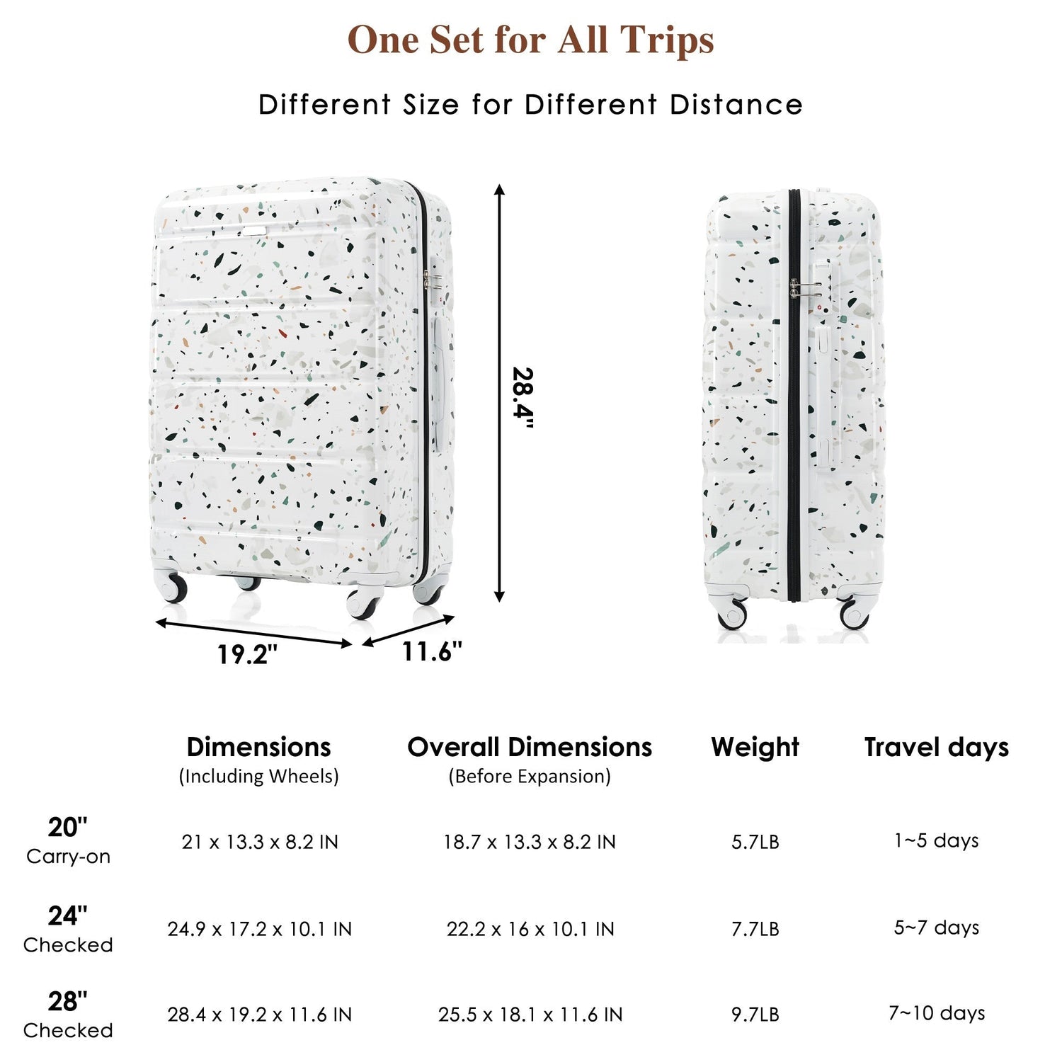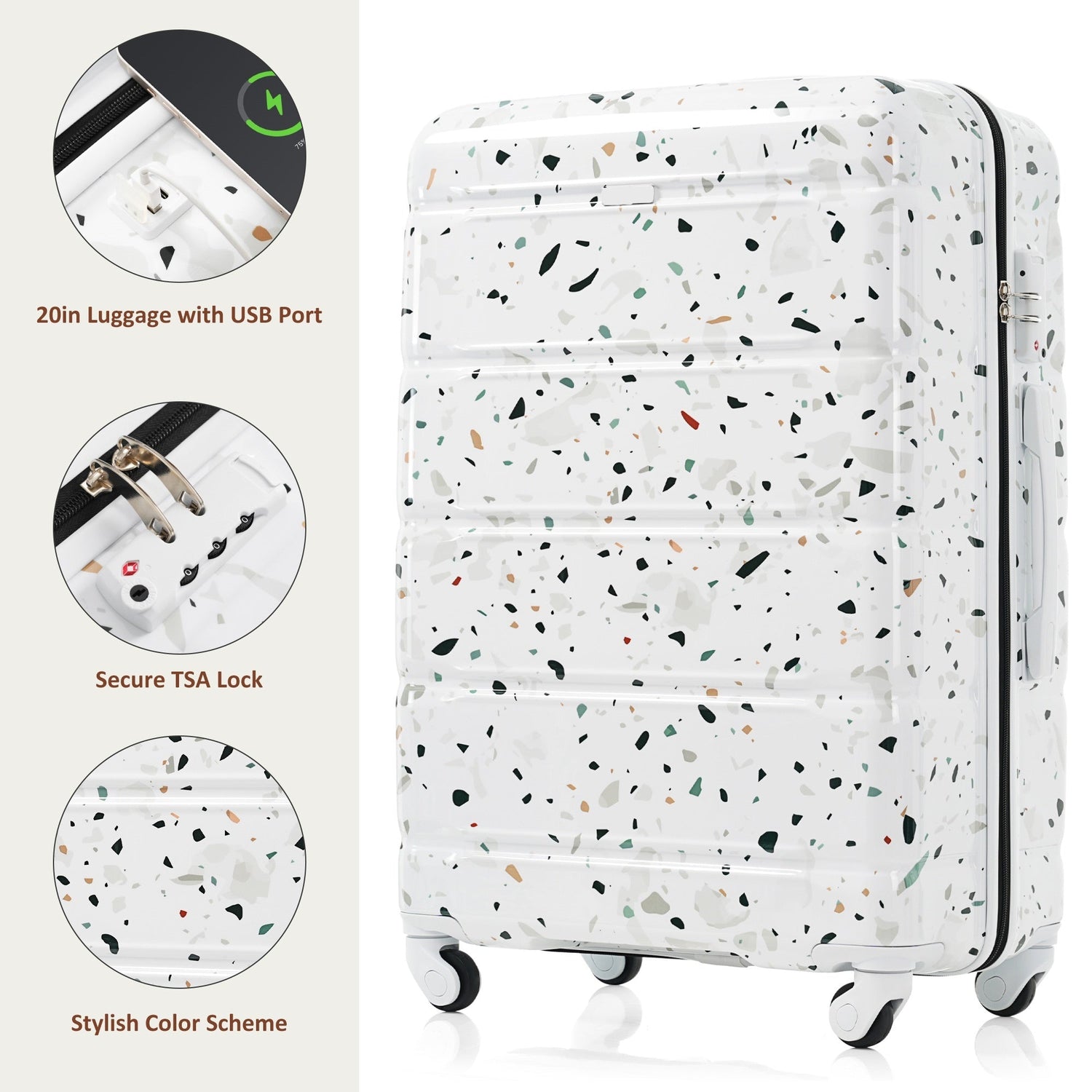 • Includes USB charging port on the 20" carry-on suitcase (power bank not included)