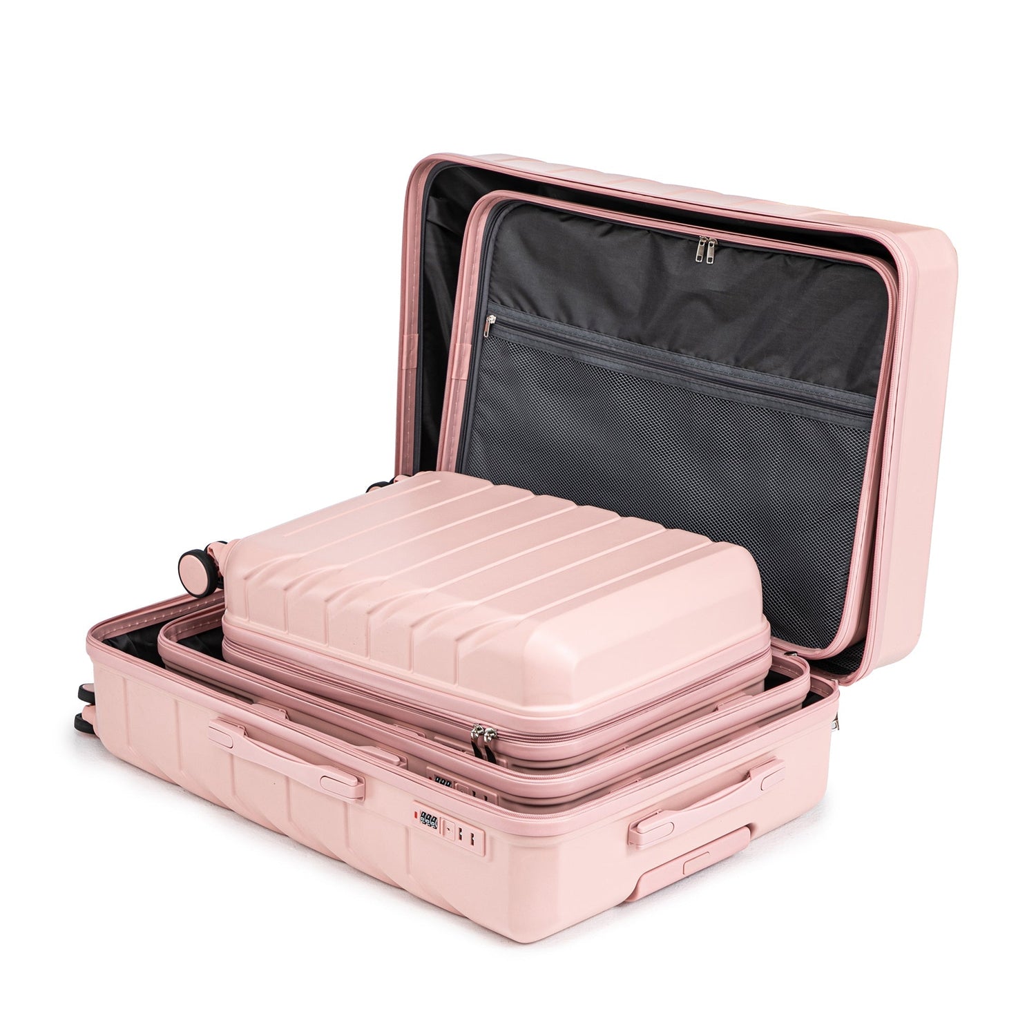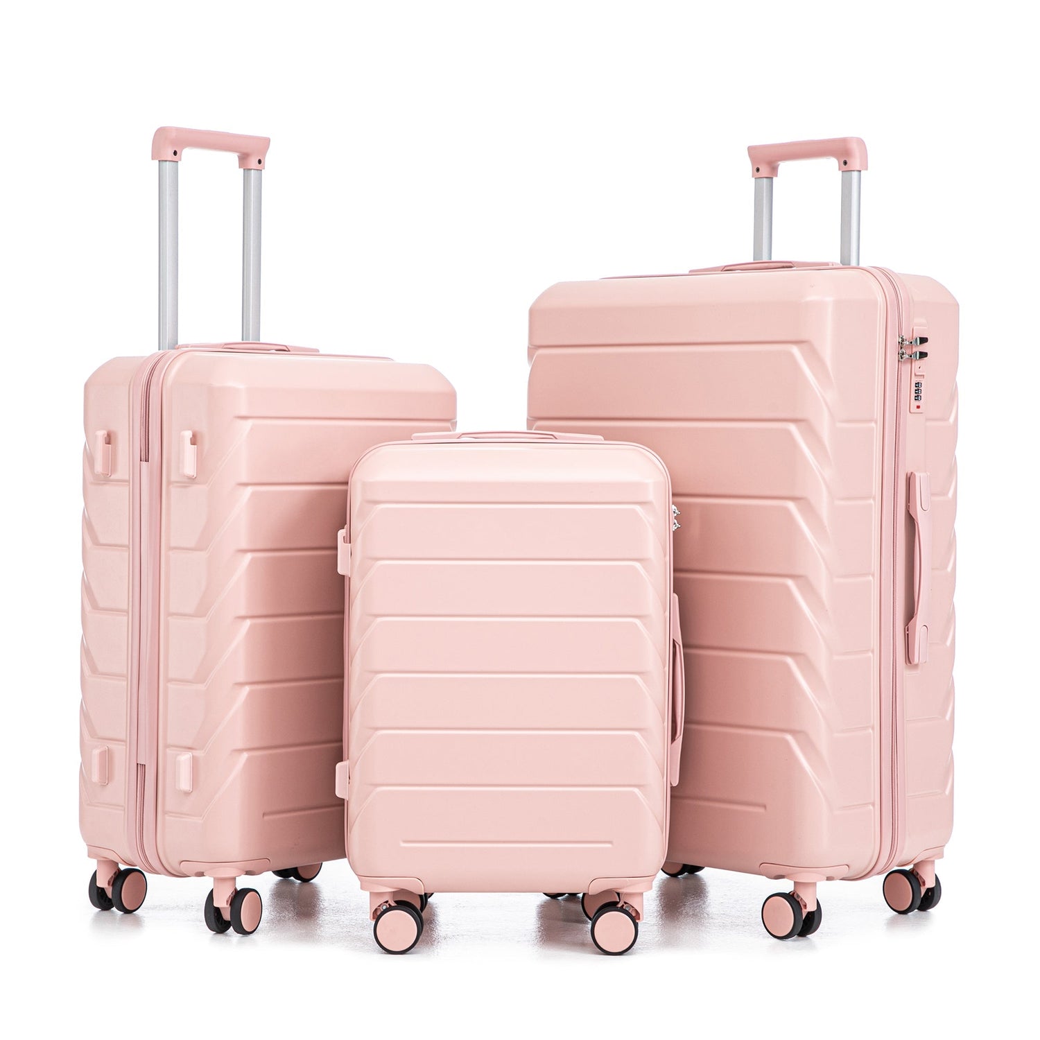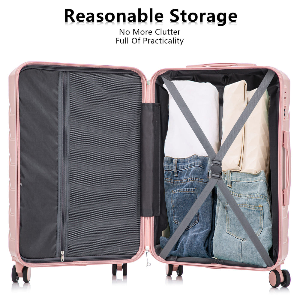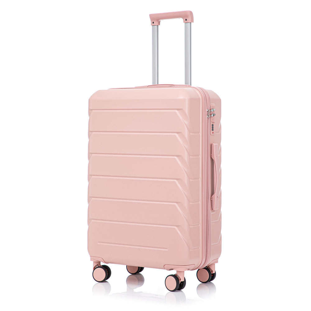 This 3-piece ABS spinner wheel luggage set is designed for organized travel with varying suitcase sizes (20", 24", 28"). Its pink exterior suits any trip, providing both style and function in luggage for all your travel needs.