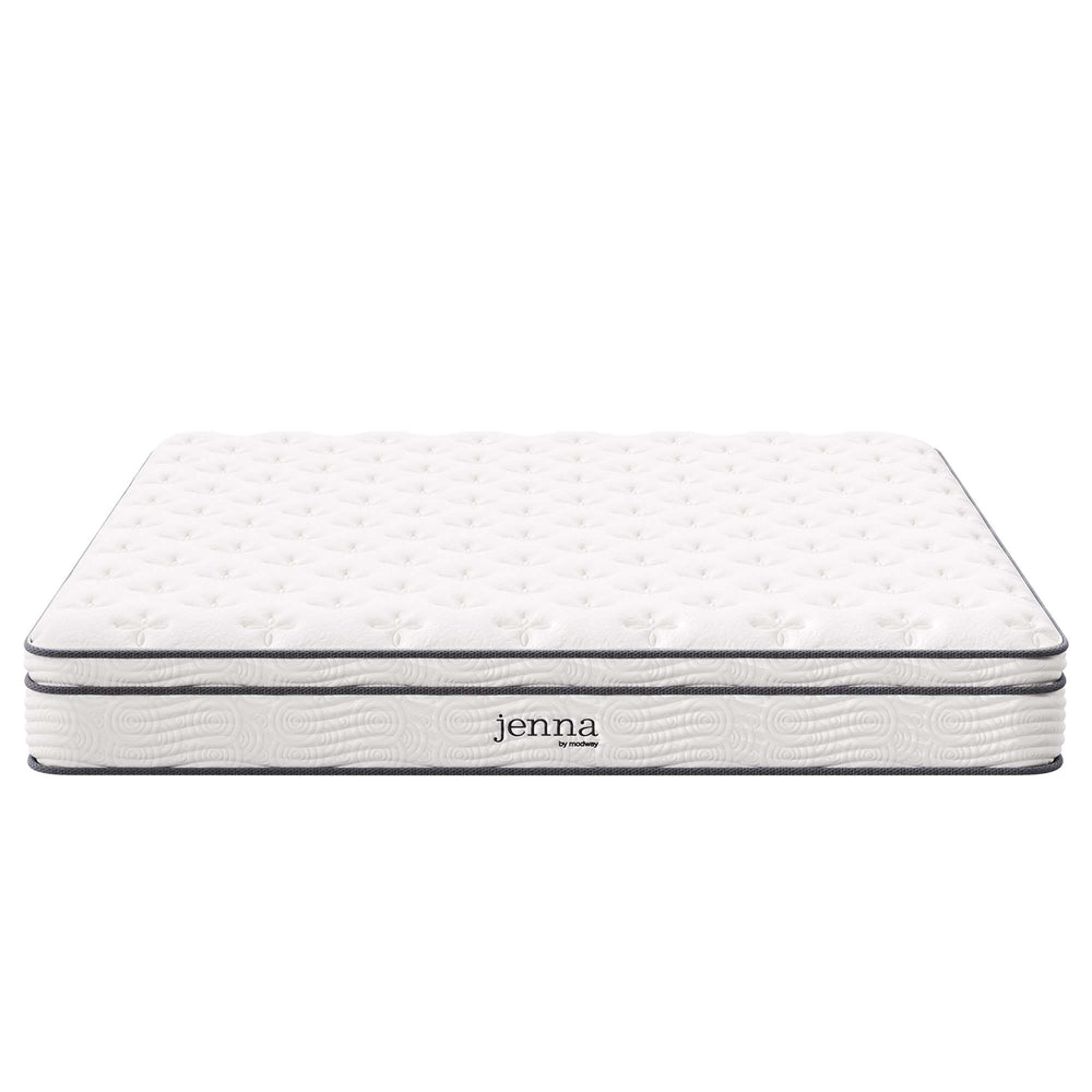 Enjoy rejuvenating sleep with the Jenna 10" Innerspring Mattress. Jenna features individually wrapped pocket coils that isolate motion between sleeping partners and provide pressure relief and spinal alignment. Responsive to the needs of the side, back, and stomach sleeping styles, Jenna's 8.5" tall coils come padded underneath a layer of responsive foam and breathable foam for maximum comfort. Complete with a quilted pillow-top cover, this hybrid mattress relieves pressure on hips, back, and shoulders, while delivering cooling airflow night after night. Jenna is a firm innerspring mattress that avoids the sag and sink of foam and air mattresses, and ships compressed and rolled into a box for easy delivery.