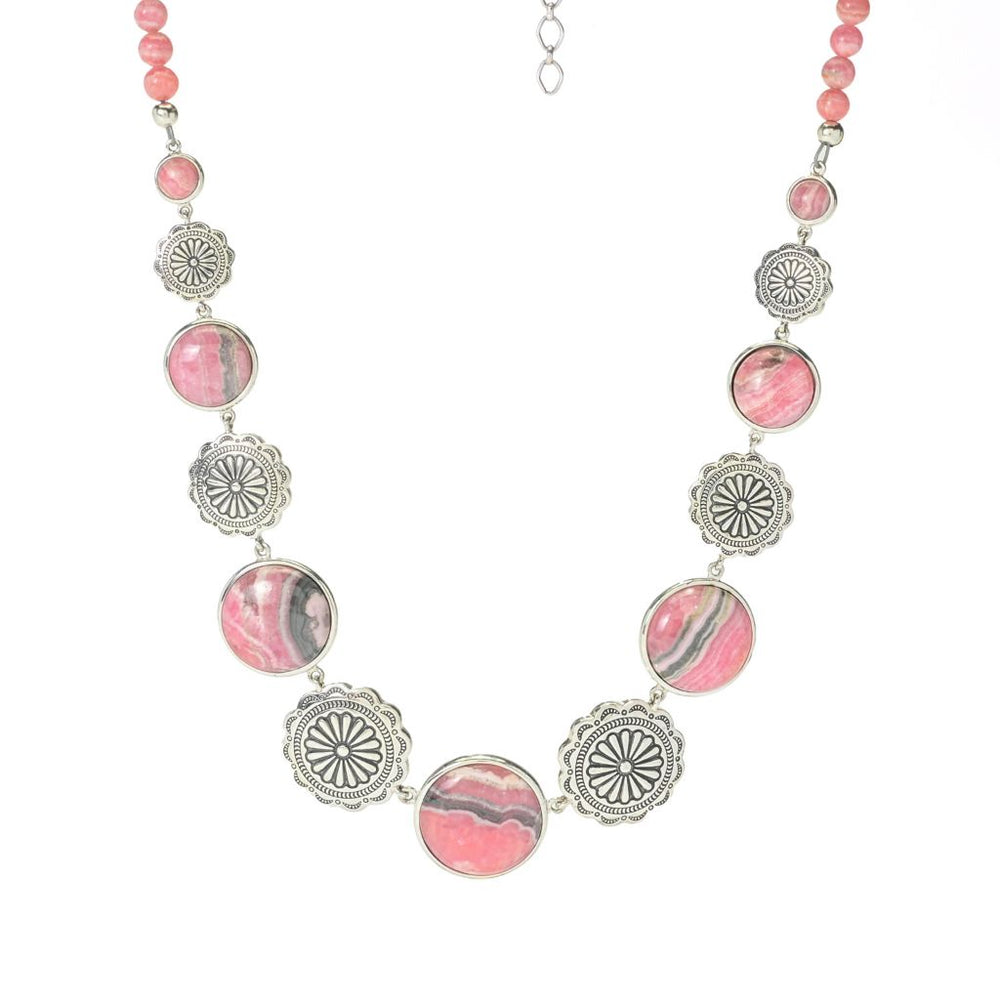 Experience the elegance of the Southwest with this exquisite necklace from Southwest Elements, crafted with sterling silver and adorned with stunning rhodochrosite gemstones.