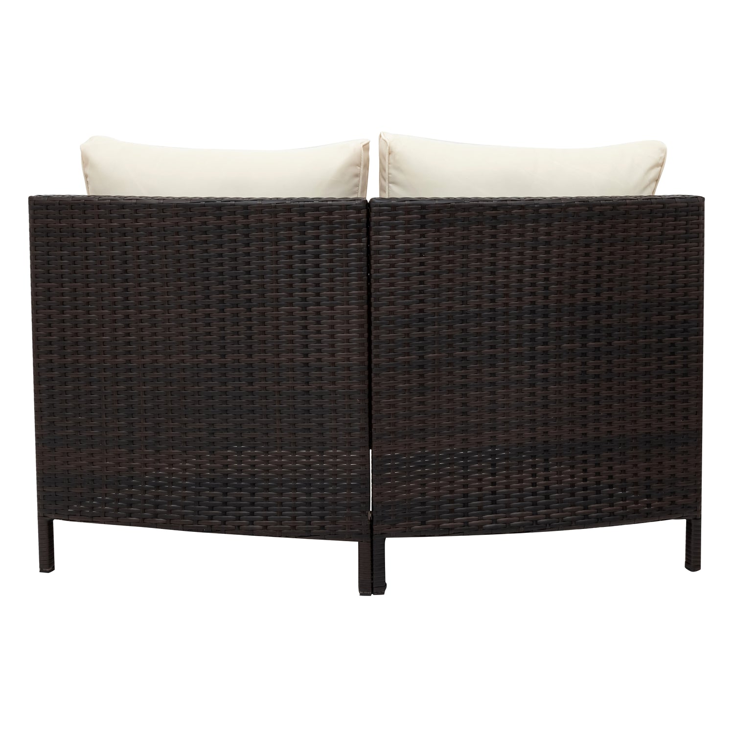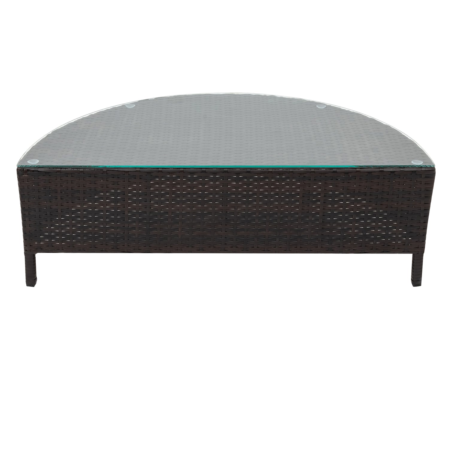 - [Sturdy Solid Frame with All-Weather PE Rattan] This patio sofa set includes 4pcs 2-person sofa and 1 half-moon tempered glass top table as well as 8 thick pillows&4 cushions. Constructed with solid steel frame, each seat can hold max 350lbs. Covered by strong but light-weighted PE rattan, this 5pcs rattan sofa set is designed to all-weathered with UV resistant and water-resistant.