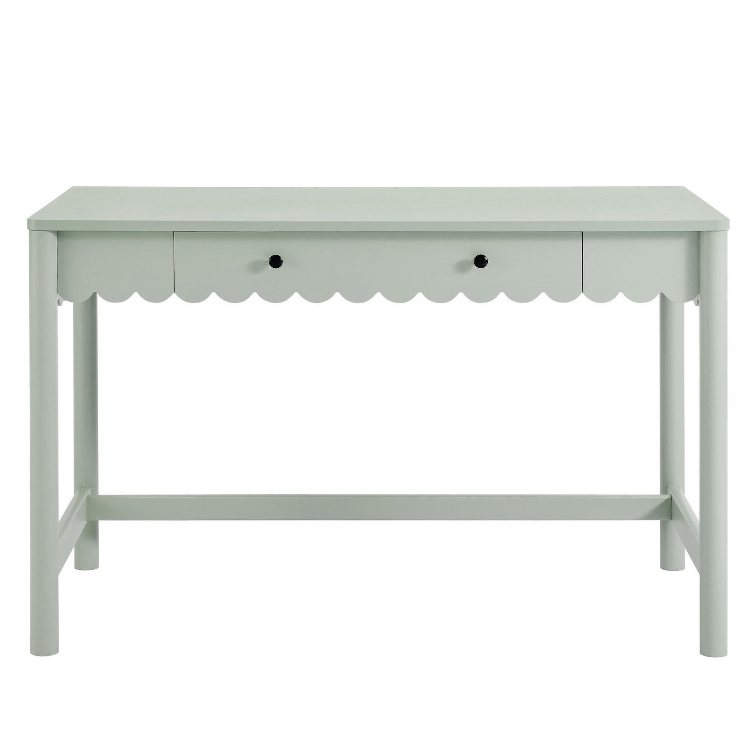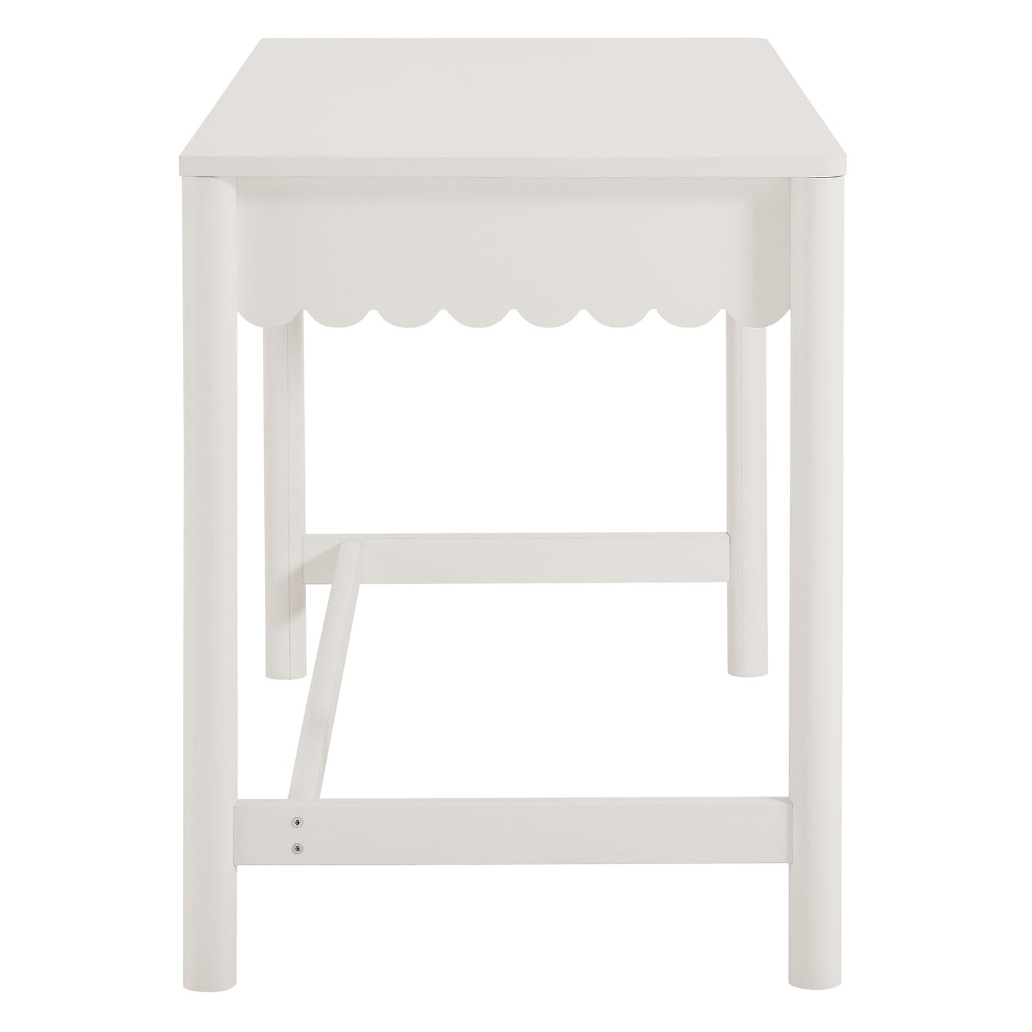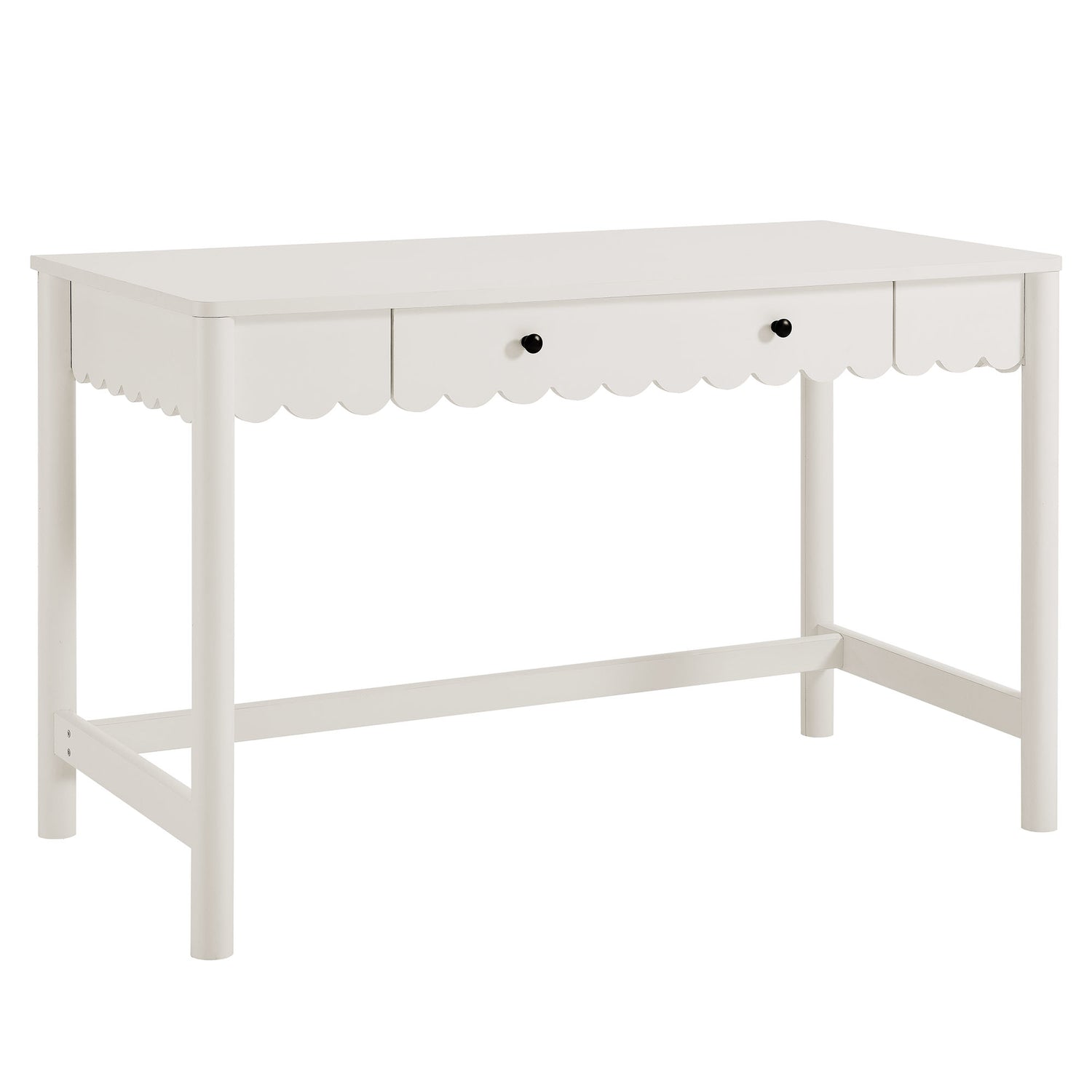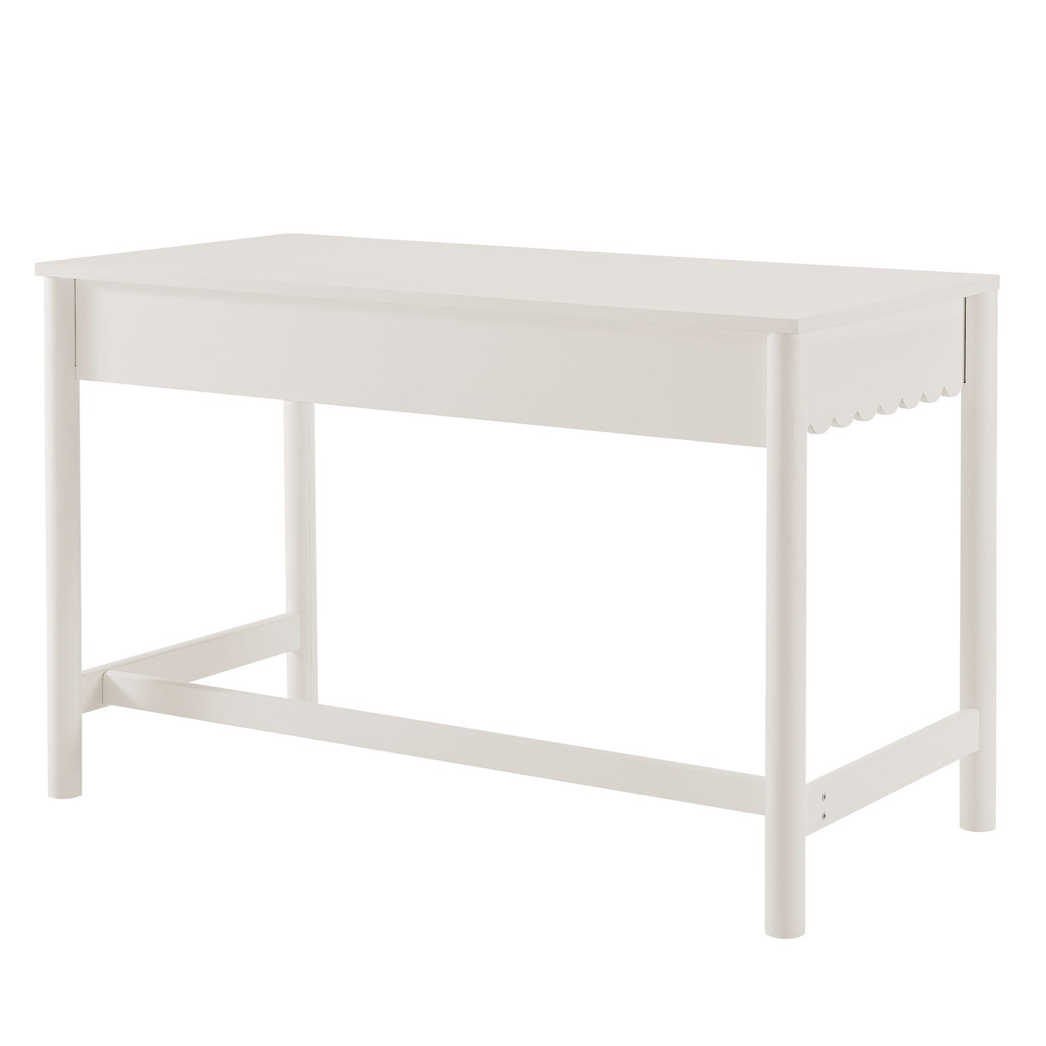 Add a touch of modern farmhouse charm to your workspace with the Emmeline Scalloped Writing Desk. Featuring a full-glide drawer with a scalloped edge detail, this writing desk combines playful design with functionality. Its smooth surface offers ample space for writing, working, or setting up a computer, while the wavy drawer front provides convenient storage for office supplies, notebooks, or makeup essentials. Crafted with sturdy construction and a smooth laminate finish, this desk is perfect for bedrooms, home offices, or even as a vanity desk. The Emmeline Small Desk delivers versatile style that fits beautifully into compact spaces, blending modern simplicity with a touch of whimsy. Assembly required.
