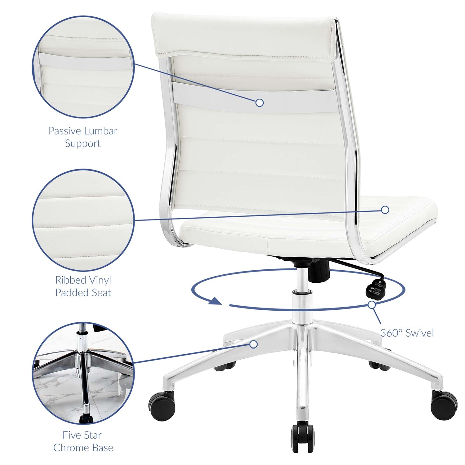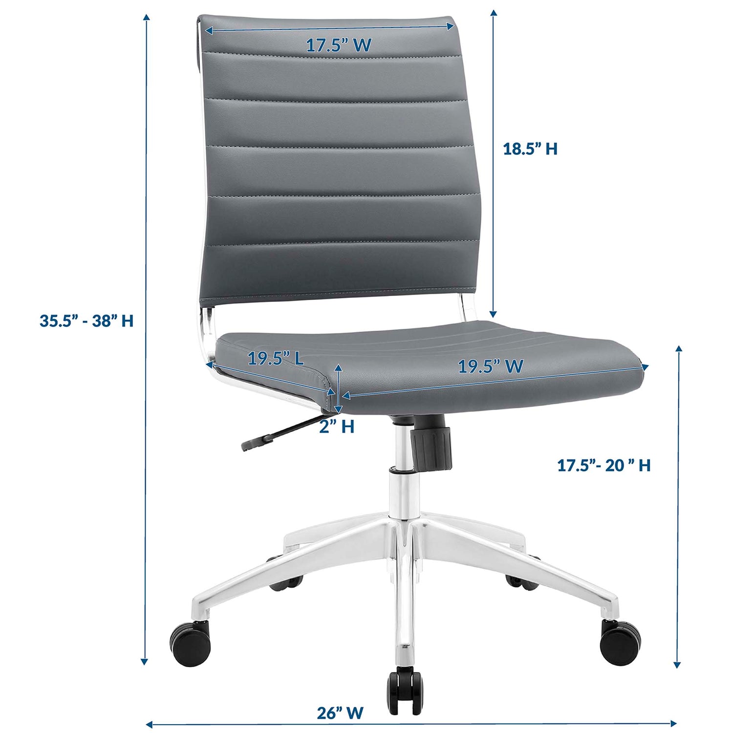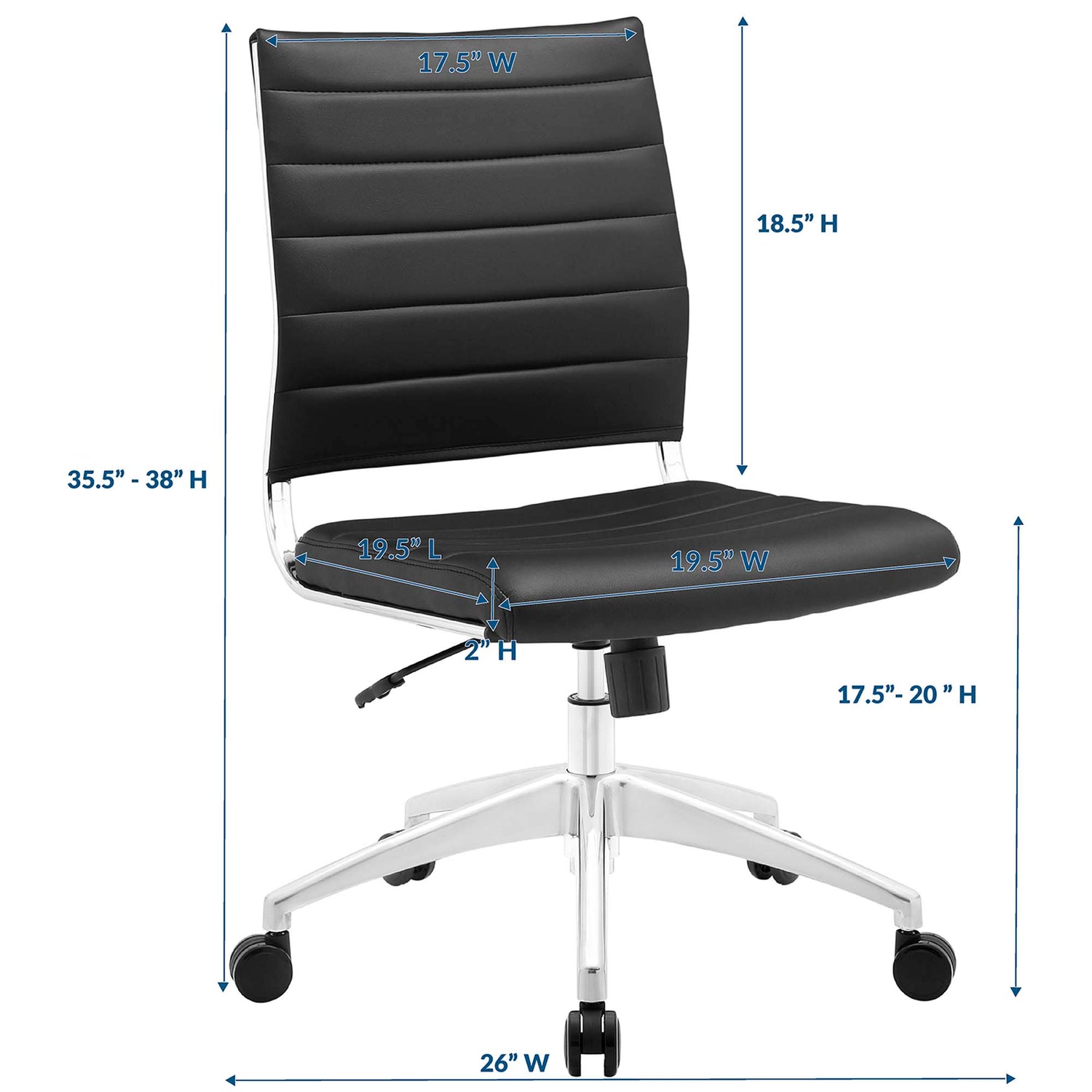 Steer the course and sail to an island called style. Jive is the result of chair makers who decided to design a chair that just works. Functionally, it is a pleasure to sit in as the durable ribbed vinyl back provides natural posture support. The seat cushion comes well padded, while the armless construction makes this a perfect piece for conference rooms and desk work. Jive's chrome-plated aluminum base is fitted with five dual-wheel casters, while a tension knob and tilt lock allow for easy back position adjustments. This is a chair made for the modern office and a welcome embodiment of the spirit of progress and determination.