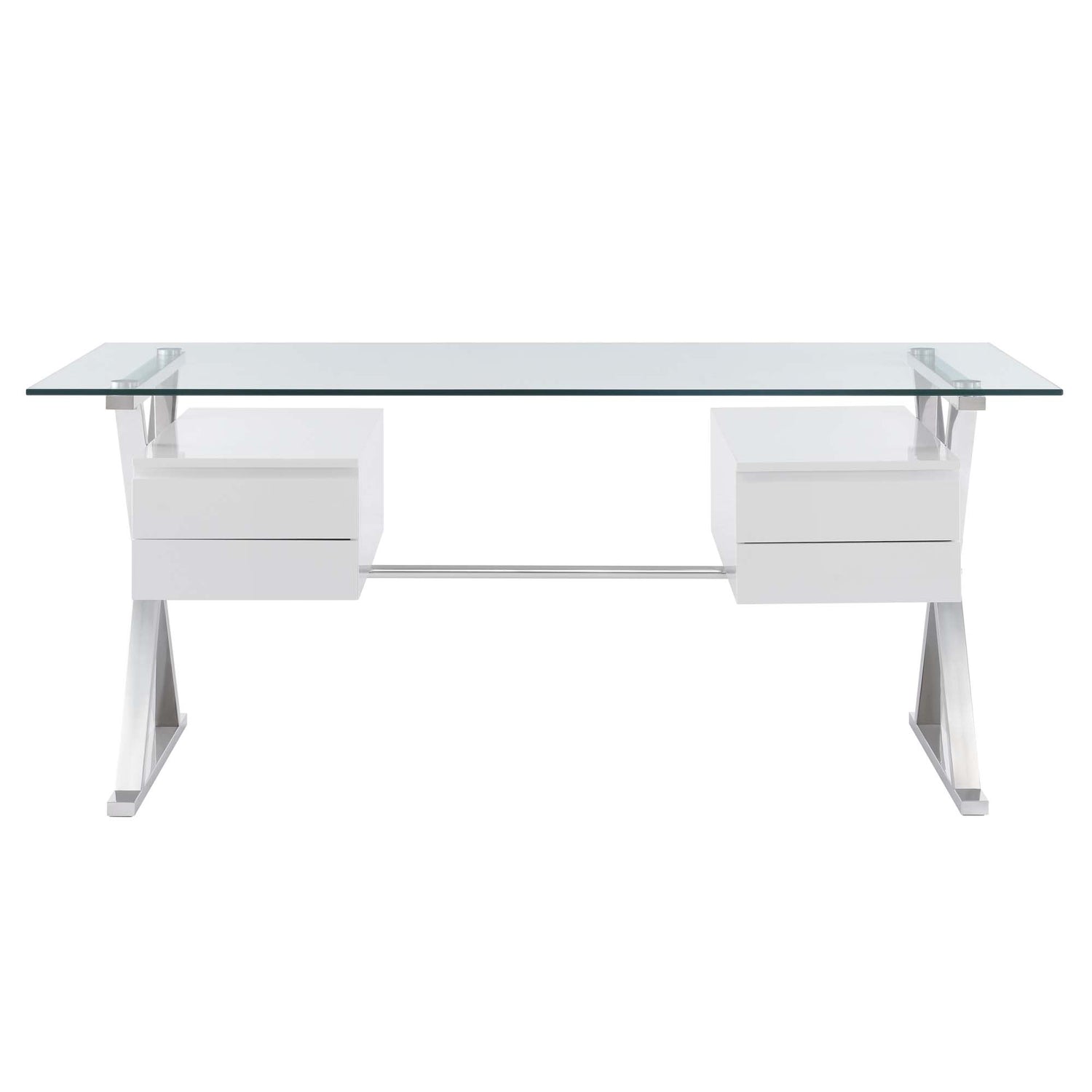 Create a space of distinction with the eye-catching, modern silhouette of the Sector Glass Top Office Desk. Resting on a polished stainless steel X frame, this computer desk is complete with a tempered glass tabletop and two sets of floating full-extension drawers that offer ample storage space for all your office essentials. Inspiring focus and productivity, this writing desk is ideal for the office, college dorm room, or any workspace. Includes non-marking foot pads to protect flooring. Assembly required. Weight Limit: 331 lbs.