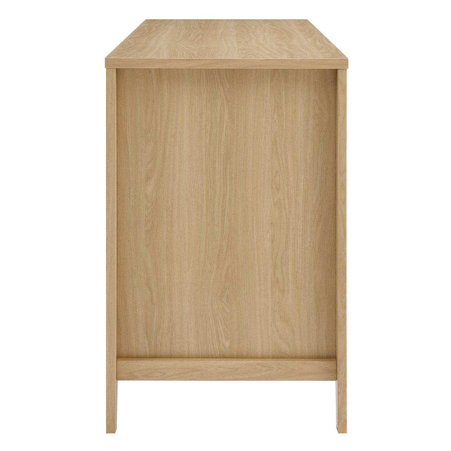 Introduce refreshing style to your workplace with the Soma 47" Office Desk. Showcasing a beautiful rattan weave on the door front of the shelved storage area, this computer desk brings organic aesthetics and modern functionality to the office, lounge area, apartment, college dorm room, or other workspace. This writing desk is crafted from durable MDF and particleboard with a natural wood grain finish. This home office desk is complete with a slide-out keyboard tray and a concealed storage area to keep visual space clean and office essentials neat and organized. Includes non-marking foot pads to protect flooring. Assembly required. Tabletop Weight Capacity: 200 lbs.