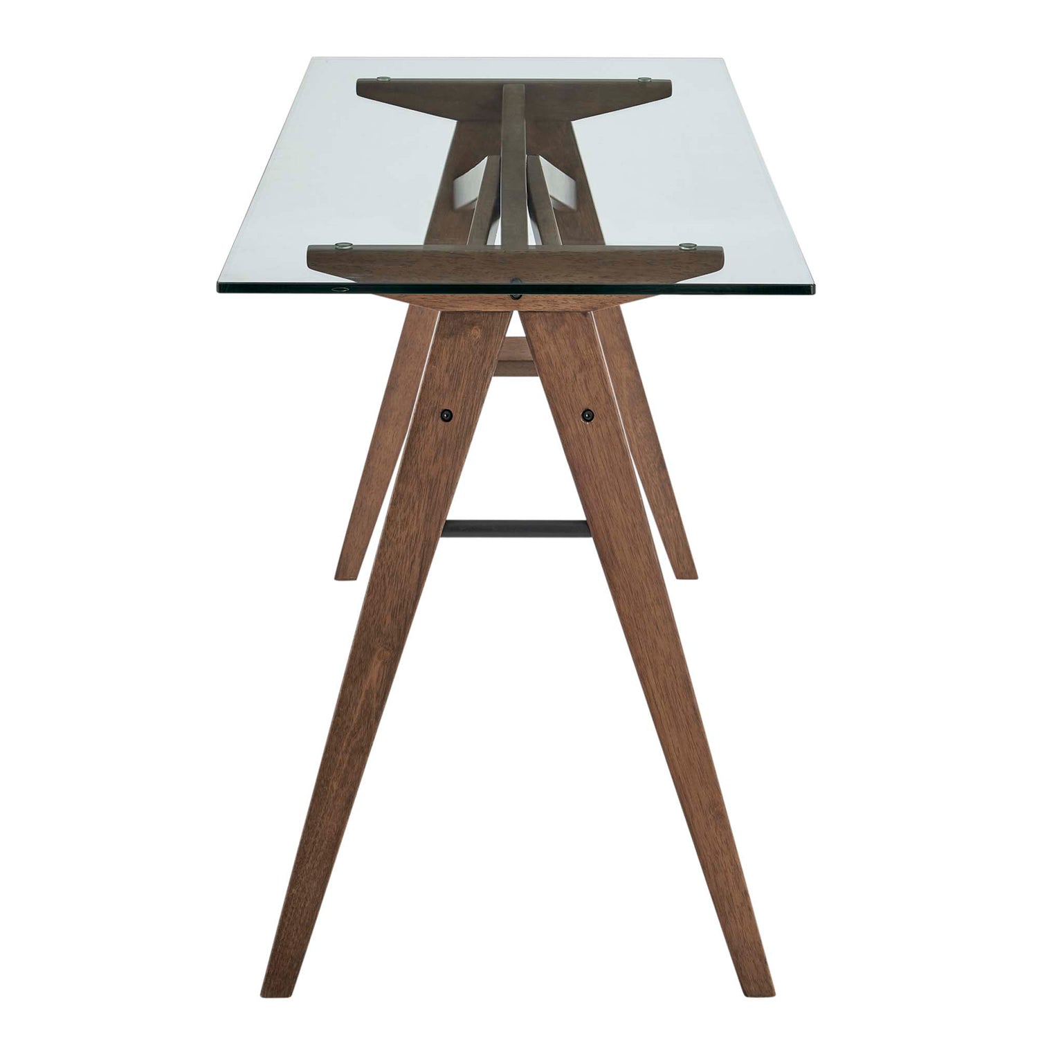 The sleek and contemporary Steadfast Glass-Top Office Desk instantly updates your home office, library, or studio. Steadfast indulges you with an efficient glass surface for working, studying, or contemplating your next move. The smooth edges of the tempered glass create a focused workspace for your laptop, computer tablet, and other work essentials. This modern office desk, carried on a solid rubberwood trestle base with a rich walnut veneer is compatible with mid-century modern or contemporary settings. Sturdily constructed with powder-coated hardware and equipped with non-marking foot pads, this stylish computer desk is a highly versatile and accommodating enhancement in the modern home or apartment.