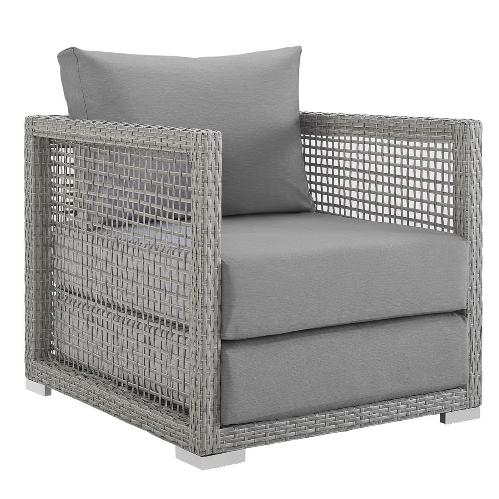 Weave conversational threads into a rollicking good time with Aura Outdoor Patio Collection. Aura comes with a synthetic gray-on-gray tone wicker rattan weave and a powder-coated aluminum frame that delivers a softly versatile outdoor collection that shifts to meet the needs of the moment. Outfitted with machine washable and fade resistant all-weather fabric cushions, and designed with an extra wide and deep body, Aura will make your outdoor spot the focal point of good memories and festive gatherings while enhancing your patio, backyard or poolside arena. Featuring thick cushions and chrome plated anti-skid feet, enjoy spacious seating and enhanced comfort with this reliable piece of outdoor furniture. Comes fully assembled.