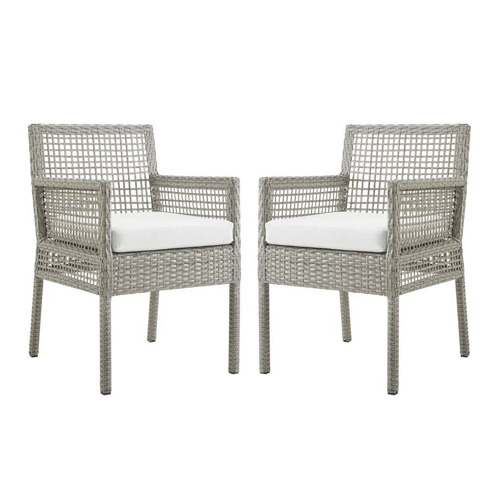 Weave conversational threads into a rollicking good time with Aura Outdoor Patio Dining Arm Chair. Aura is an outdoor dining chair that comes with a synthetic gray-on-gray tone wicker rattan weave and a powder-coated aluminum frame that delivers a softly versatile outdoor collection that shifts to meet the needs of the moment. Outfitted with a machine washable and fade resistant all-weather fabric cushion, Aura Patio Dining Chair will make your outdoor spot the focal point of good memories and festive gatherings while enhancing your patio, backyard or poolside arena. Complete with non-marking foot caps, enjoy spacious seating and enhanced comfort with this reliable piece of outdoor furniture.