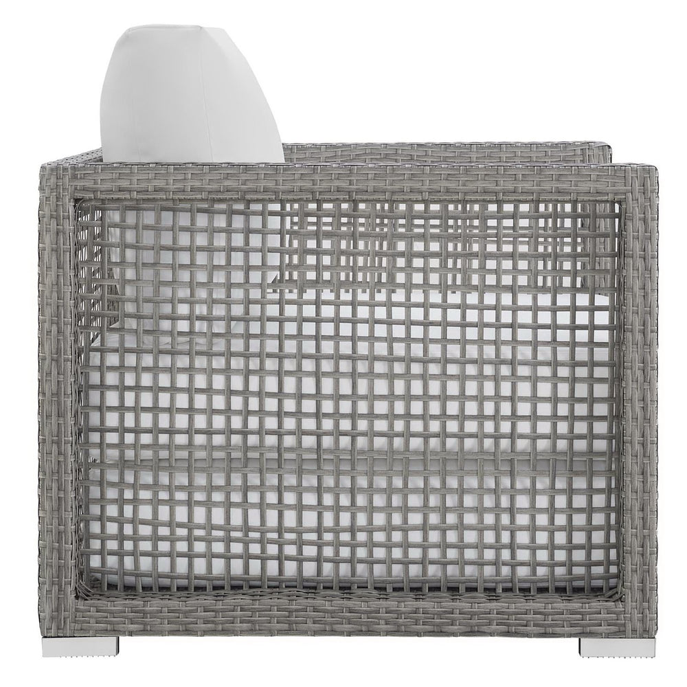 Weave conversational threads into a rollicking good time with Aura Outdoor Patio Armchair. Aura comes with a synthetic gray-on-gray tone wicker rattan weave and a powder-coated aluminum frame that delivers a softly versatile outdoor collection that shifts to meet the needs of the moment. Outfitted with machine washable and fade resistant all-weather fabric cushions, and designed with an extra wide and deep body, Aura will make your outdoor spot the focal point of good memories and festive gatherings while enhancing your patio, backyard or poolside arena. Featuring thick cushions and chrome plated anti-skid feet, enjoy spacious seating and enhanced comfort with this reliable piece of outdoor furniture. Comes fully assembled.
