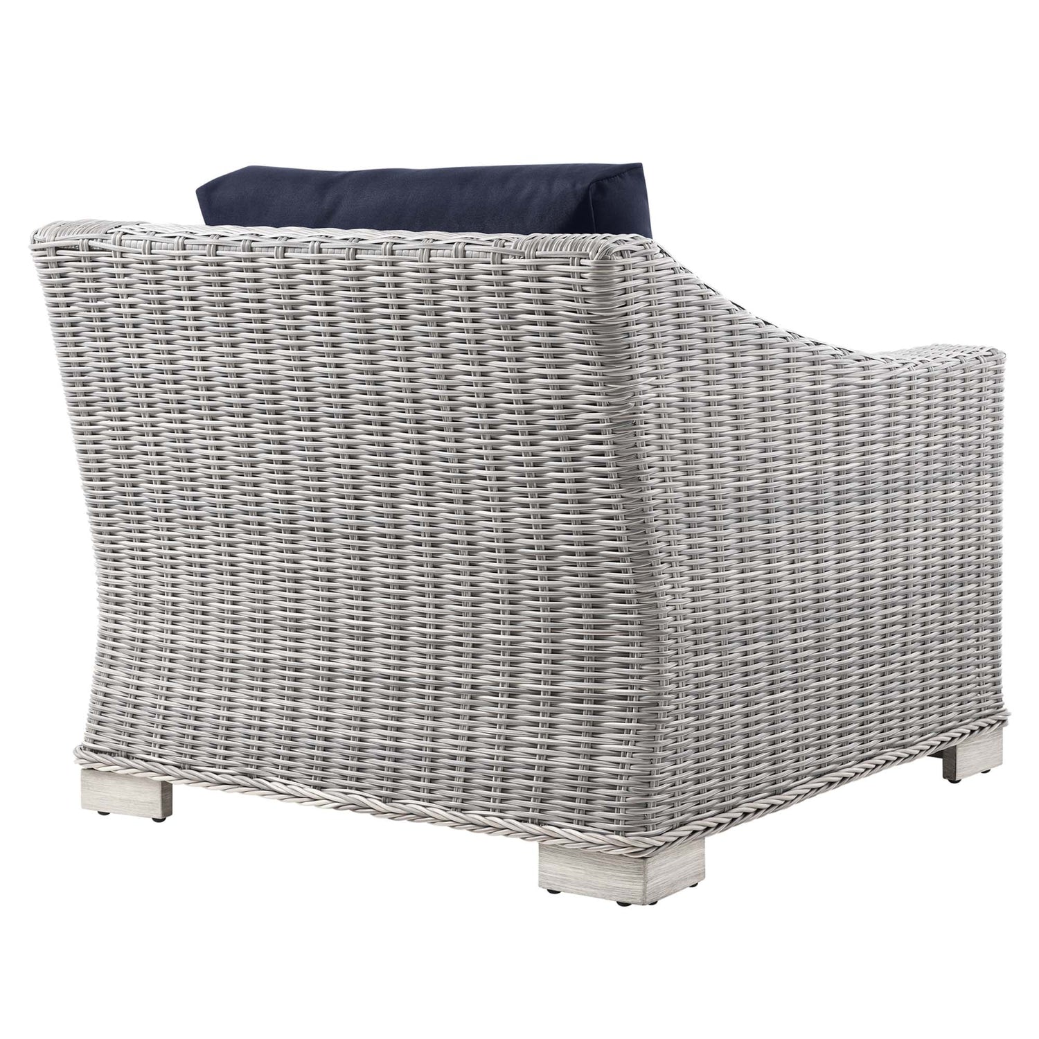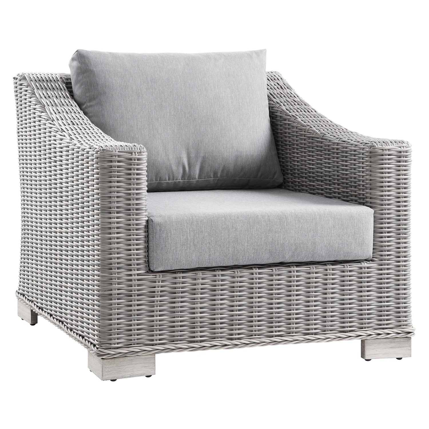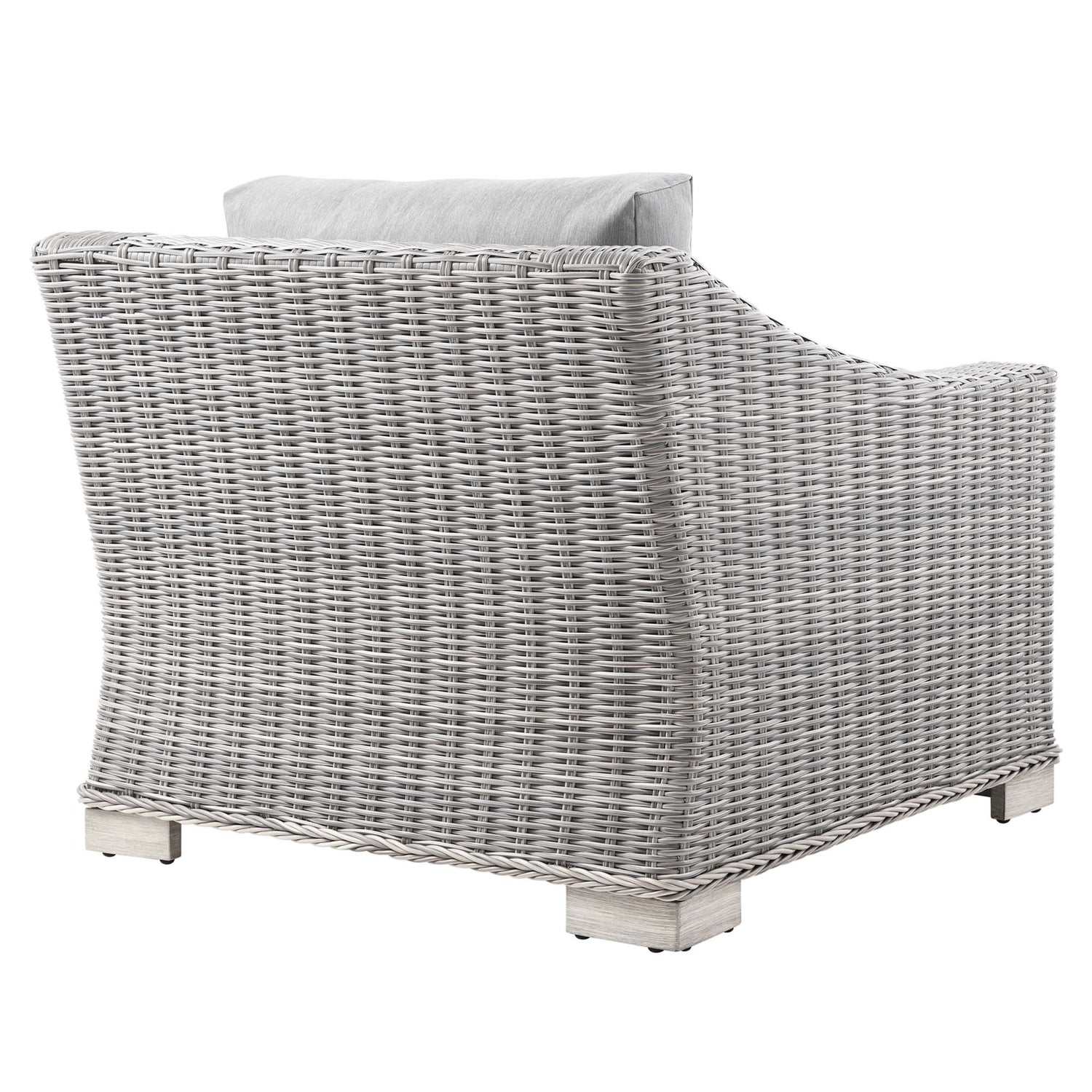 Enjoy fresh air and alfresco relaxation with the Conway Outdoor Patio Wicker Rattan Armchair. Wrapped in UV-resistant light gray synthetic wicker rattan, this patio chair boasts organic texture and a neutral hue that brings a calming presence to your outdoor space. The frame of this outdoor chair is crafted with durable powder-coated aluminum and rests on L-shaped legs with plastic foot glides. Thick foam padded cushions covered with removable, water-resistant polyester covers offer a comfortable seat and affix securely to the lounge chair with cord tension attachments. Trending aesthetics and a classic design define this outdoor patio furniture collection making it a beautiful addition to any outdoor space including the backyard, patio, porch, balcony, or poolside. Assembly required. Patio Chair Weight Capacity: 300 lbs.