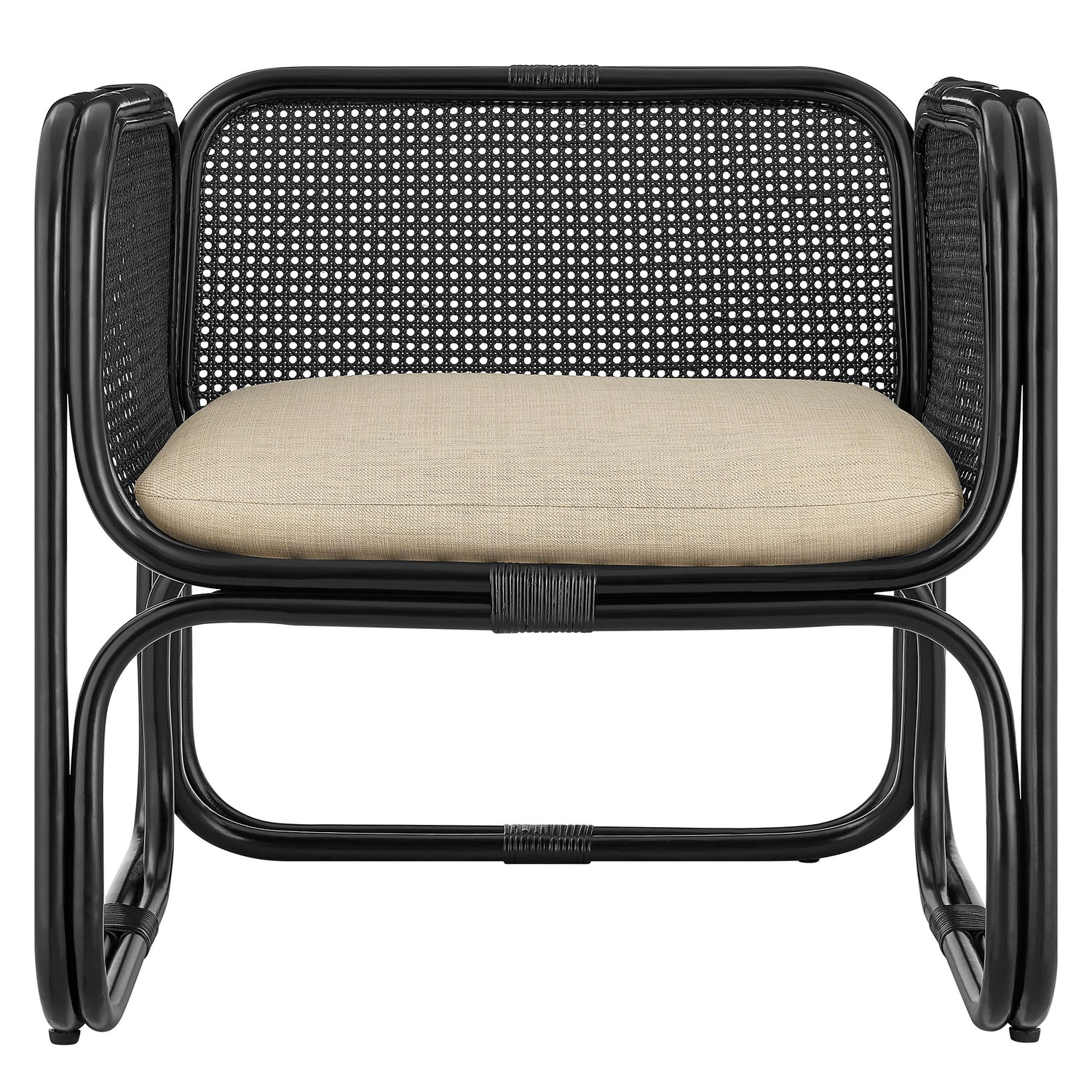 Shaped with a playful mix of curves and angles, the Ellis rattan lounge chair brings a fresh, laid-back energy to living rooms, bedrooms, or sun-filled nooks. Its continuous frame flows smoothly from backrest to base, wrapping around open-weave panels that keep the silhouette light and airy from every angle. A padded seat cushion with a machine washable cover adds comfort without fuss, while the low-slung design makes it a natural pick for reading, relaxing, or unwinding in a quiet corner. Built for everyday use, this rattan accent chair comes fully assembled with non-marking foot caps, making it just as suitable for covered patios or garden rooms. Product Note: Due to the natural qualities of rattan, slight variations in color and pattern are to be expected, adding to each piece�s unique character.