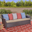 - This three seater sofa is the perfect addition to any backyard or patio. Featuring a sturdy wicker construction over a steel frame, this sofa is not only well built, but stylish as well. With slightly curved arm rests for a hit of flair along with a seat cushion for maximum comfort, this safe is a must have. Enjoy it in your back yard today.