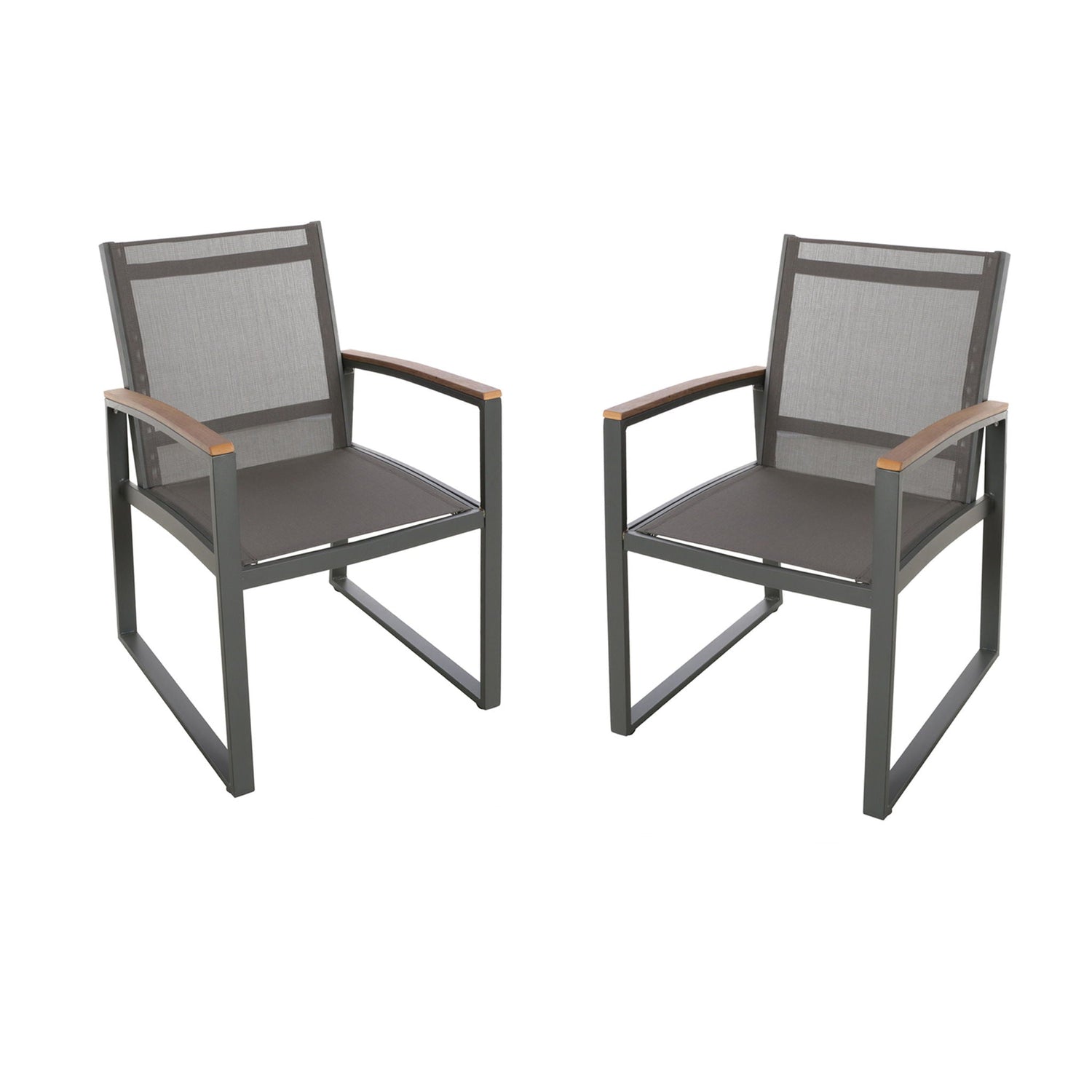 - Constructed with rust-proof aluminum frames and faux-wood arms for a durable and stylish look