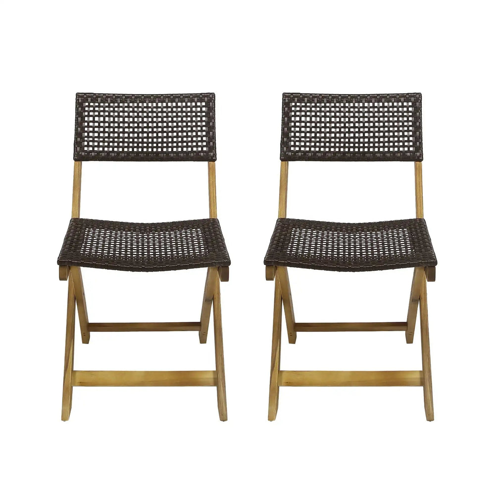 This bistro foldable chair features a woven wicker backrest and is crafted for use in outdoor spaces such as patios and gardens. It combines practical foldability with a rustic, organic style to complement any outdoor seating arrangement.